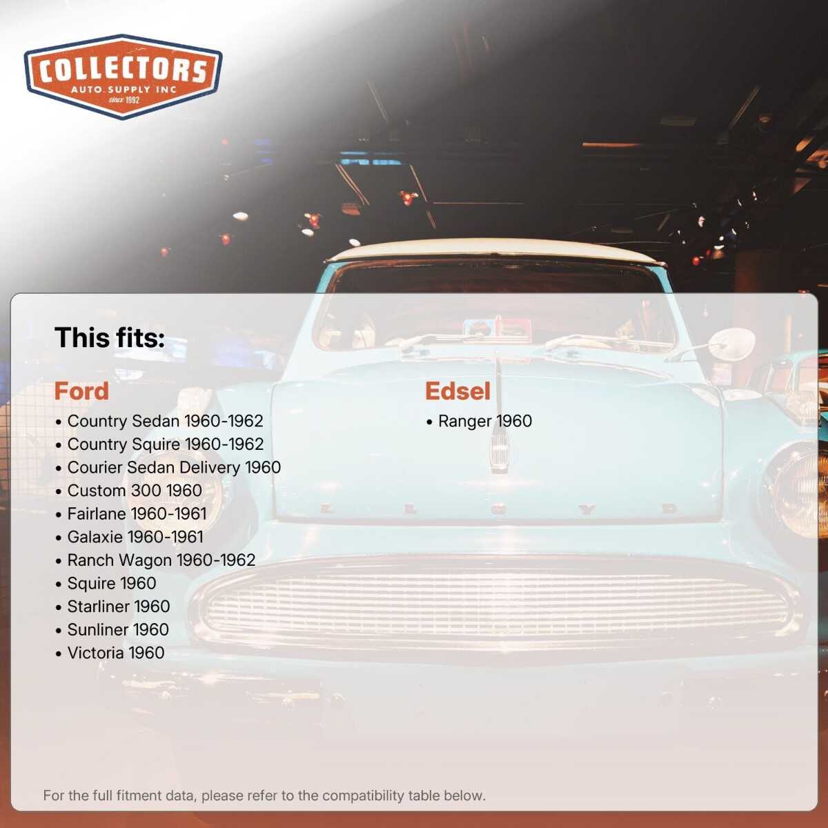 You can purchase this product directly from Collectors Auto Supply, where we specialize in classic car restoration parts and accessories. Finding the perfect part for your classic car can be difficult, and even frustrating. And let us be honest. What makes it worse is a general lack of customer love in the industry. That is why we are here, and that is why we are different. We are car people just like you, and we know what you need. And if we do not already know it, we're listening. So, contact us if you need help finding a part, or have an idea for how to improve our website, or anything else. Or if you want to do it the old-fashioned way, give us a call at 1 (800) 414-4462.