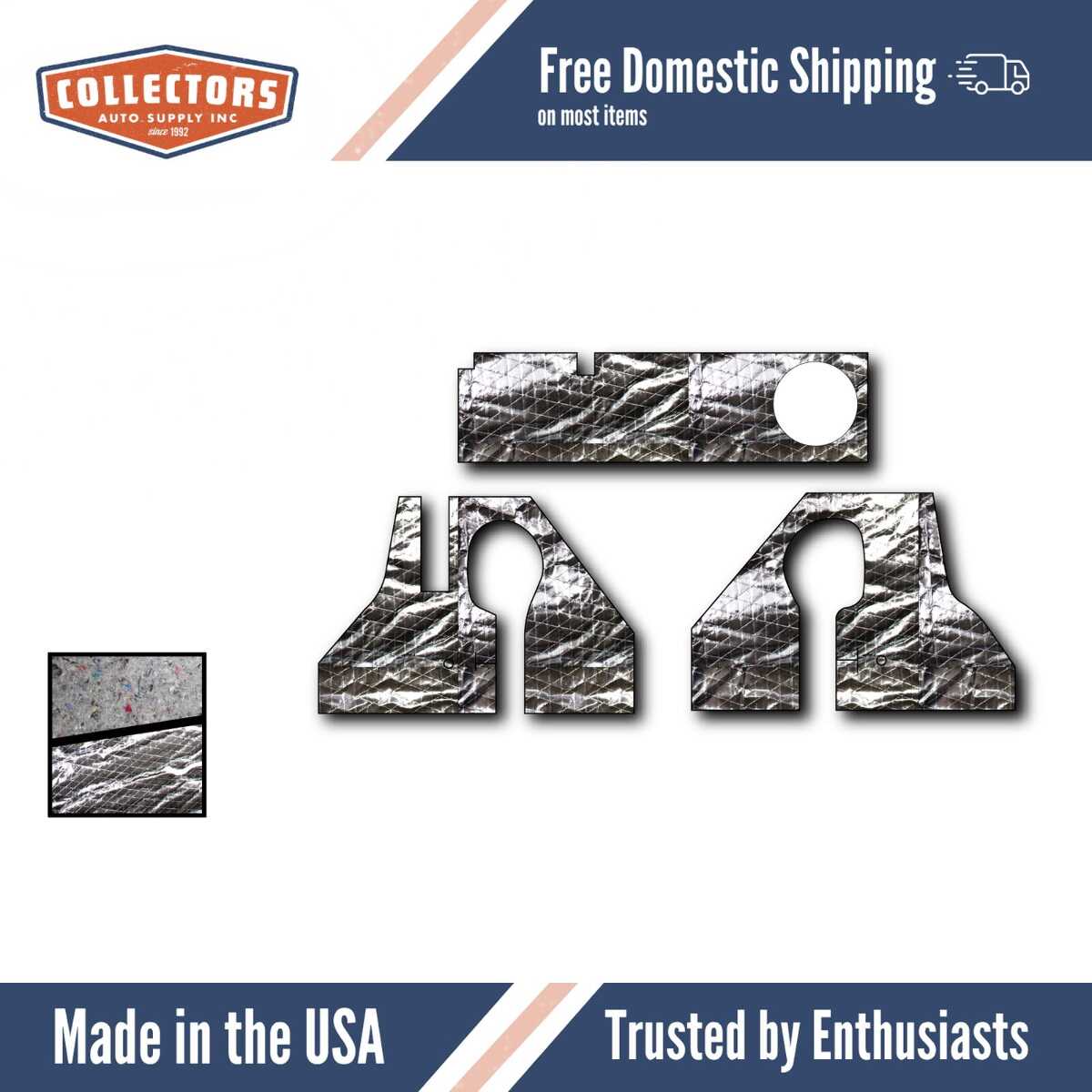 It is an insulation material that installs on the floor pan of the vehicle, reducing road noise, blocking heat from the exhaust and drivetrain, and dampening vibration.