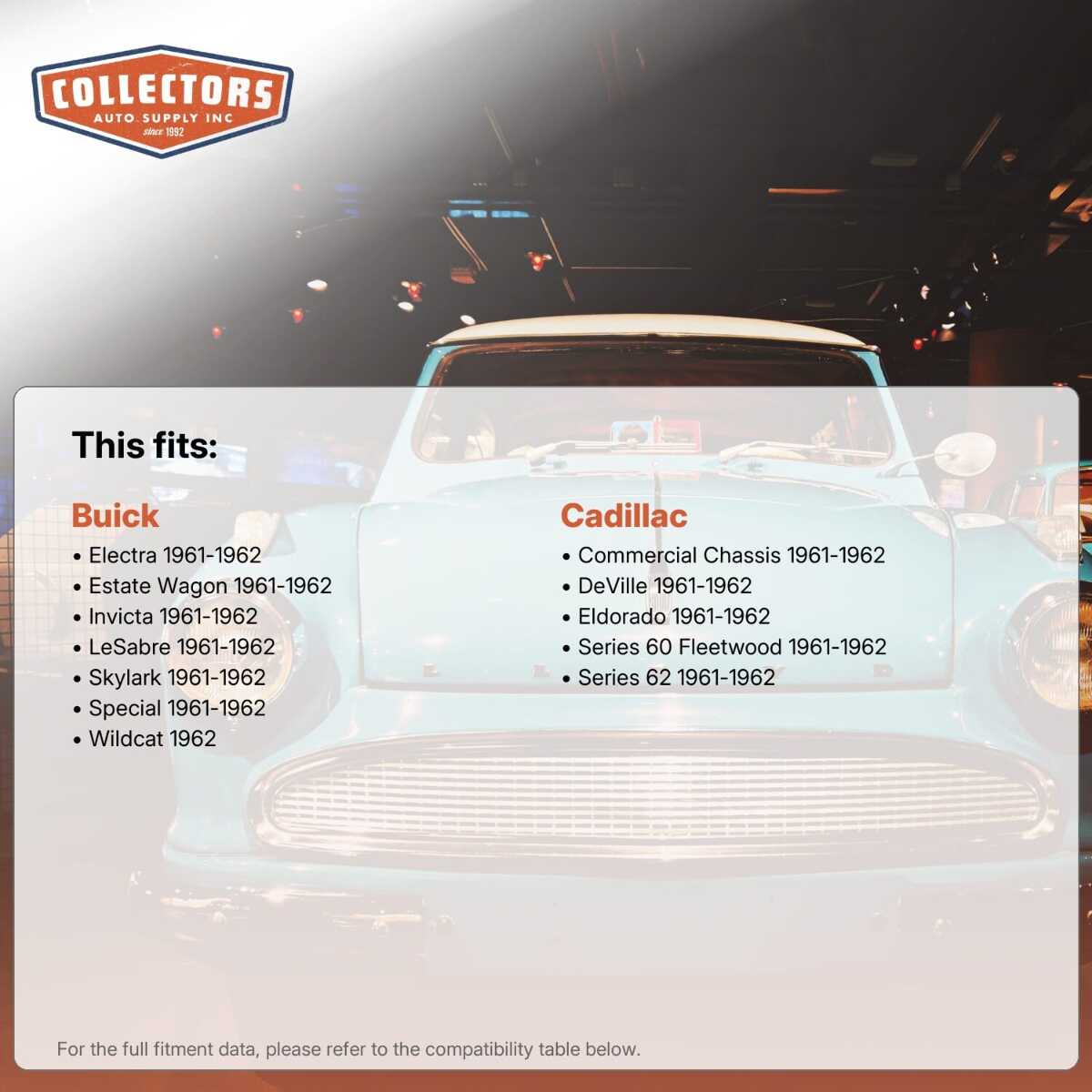 You can purchase this product directly from Collectors Auto Supply, where we specialize in classic car restoration parts and accessories. Finding the perfect part for your classic car can be difficult, and even frustrating. And let us be honest. What makes it worse is a general lack of customer love in the industry. That is why we are here, and that is why we are different. We are car people just like you, and we know what you need. And if we do not already know it, we're listening. So, contact us if you need help finding a part, or have an idea for how to improve our website, or anything else. Or if you want to do it the old-fashioned way, give us a call at 1 (800) 414-4462.