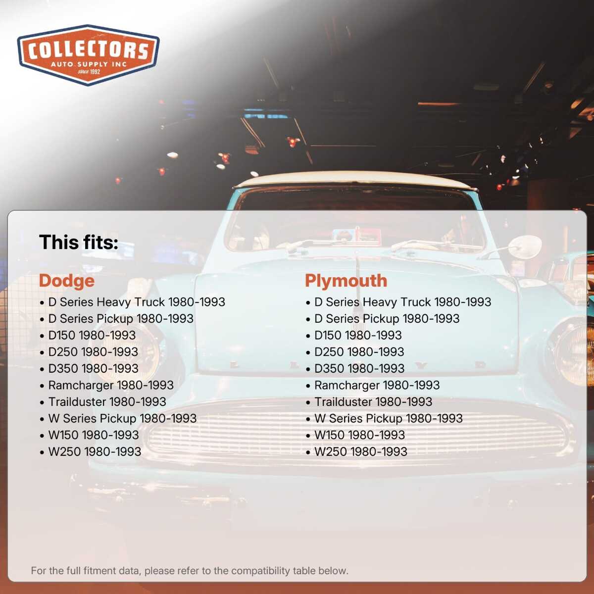 You can purchase this product directly from Collectors Auto Supply, where we specialize in classic car restoration parts and accessories. Finding the perfect part for your classic car can be difficult, and even frustrating. And let us be honest. What makes it worse is a general lack of customer love in the industry. That is why we are here, and that is why we are different. We are car people just like you, and we know what you need. And if we do not already know it, we're listening. So, contact us if you need help finding a part, or have an idea for how to improve our website, or anything else. Or if you want to do it the old-fashioned way, give us a call at 1 (800) 414-4462.