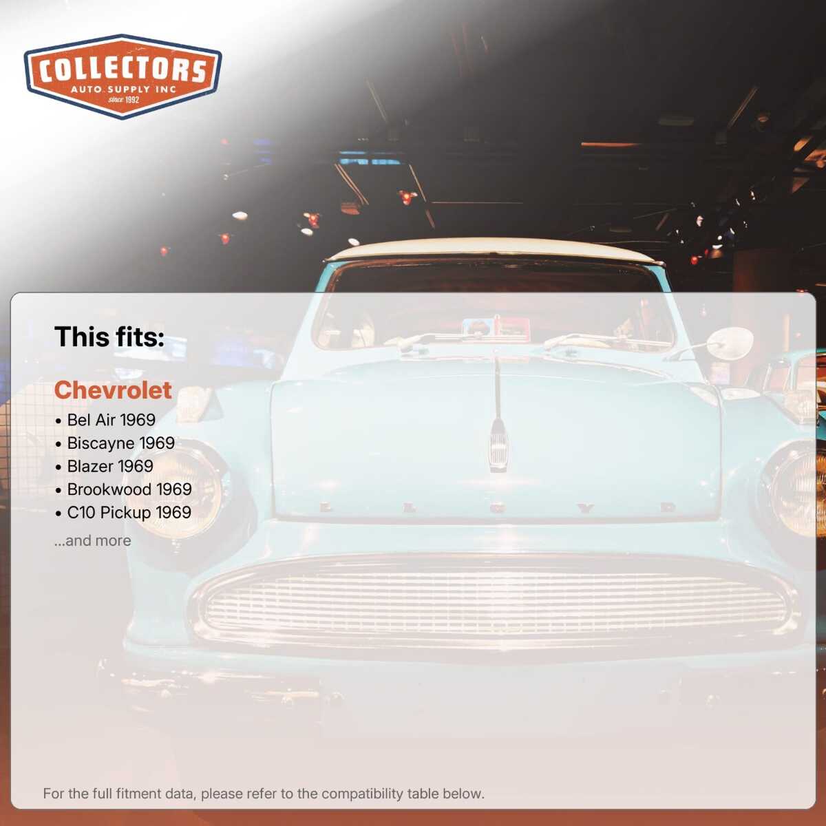 You can purchase this product directly from Collectors Auto Supply, where we specialize in classic car restoration parts and accessories. Finding the perfect part for your classic car can be difficult, and even frustrating. And let us be honest. What makes it worse is a general lack of customer love in the industry. That is why we are here, and that is why we are different. We are car people just like you, and we know what you need. And if we do not already know it, we're listening. So, contact us if you need help finding a part, or have an idea for how to improve our website, or anything else. Or if you want to do it the old-fashioned way, give us a call at 1 (800) 414-4462.