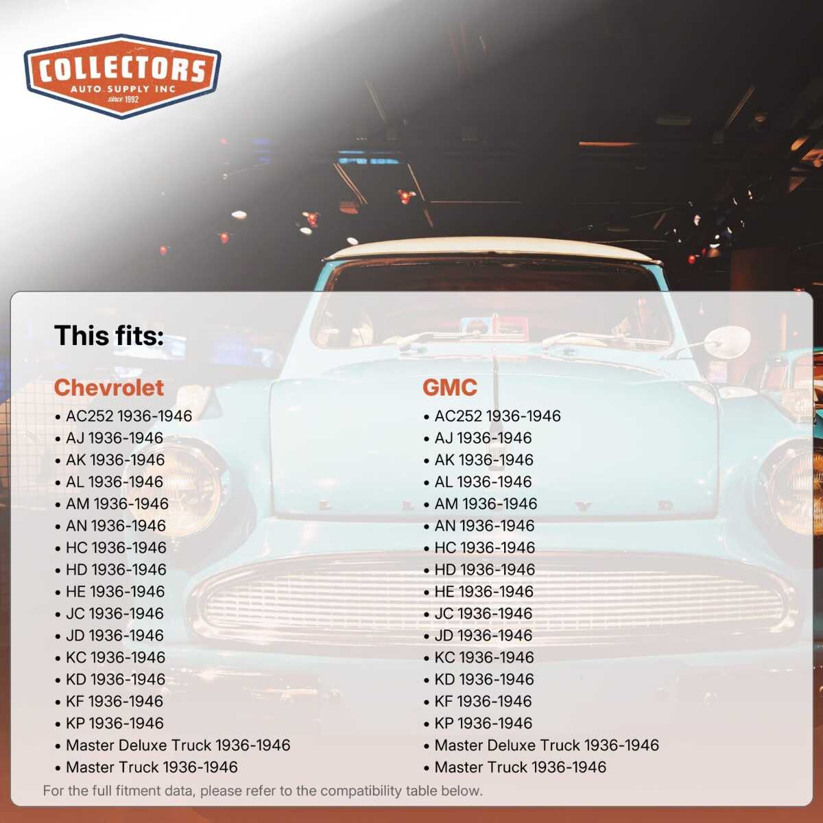 You can purchase this product directly from Collectors Auto Supply, where we specialize in classic car restoration parts and accessories. Finding the perfect part for your classic car can be difficult, and even frustrating. And let us be honest. What makes it worse is a general lack of customer love in the industry. That is why we are here, and that is why we are different. We are car people just like you, and we know what you need. And if we do not already know it, we're listening. So, contact us if you need help finding a part, or have an idea for how to improve our website, or anything else. Or if you want to do it the old-fashioned way, give us a call at 1 (800) 414-4462.