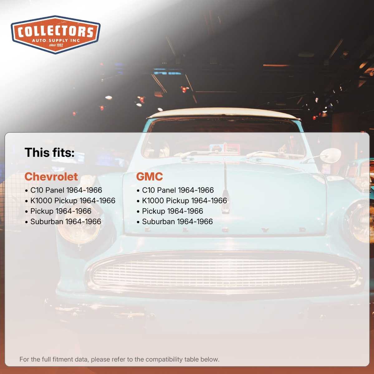You can purchase this product directly from Collectors Auto Supply, where we specialize in classic car restoration parts and accessories. Finding the perfect part for your classic car can be difficult, and even frustrating. And let us be honest. What makes it worse is a general lack of customer love in the industry. That is why we are here, and that is why we are different. We are car people just like you, and we know what you need. And if we do not already know it, we're listening. So, contact us if you need help finding a part, or have an idea for how to improve our website, or anything else. Or if you want to do it the old-fashioned way, give us a call at 1 (800) 414-4462.
