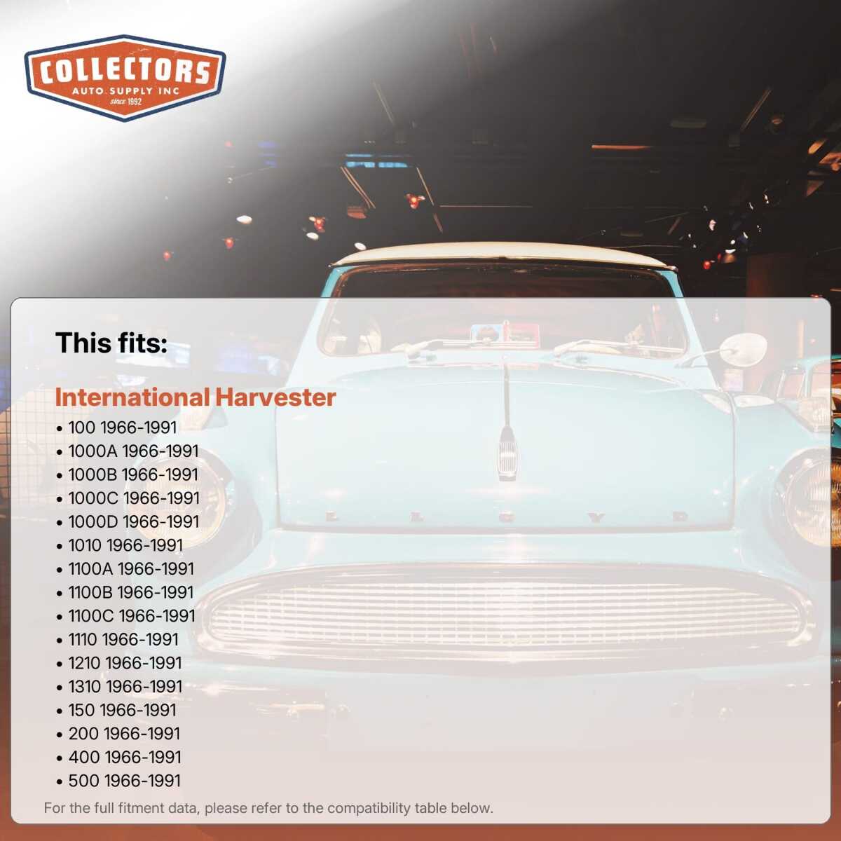 You can purchase this product directly from Collectors Auto Supply, where we specialize in classic car restoration parts and accessories. Finding the perfect part for your classic car can be difficult, and even frustrating. And let us be honest. What makes it worse is a general lack of customer love in the industry. That is why we are here, and that is why we are different. We are car people just like you, and we know what you need. And if we do not already know it, we're listening. So, contact us if you need help finding a part, or have an idea for how to improve our website, or anything else. Or if you want to do it the old-fashioned way, give us a call at 1 (800) 414-4462.