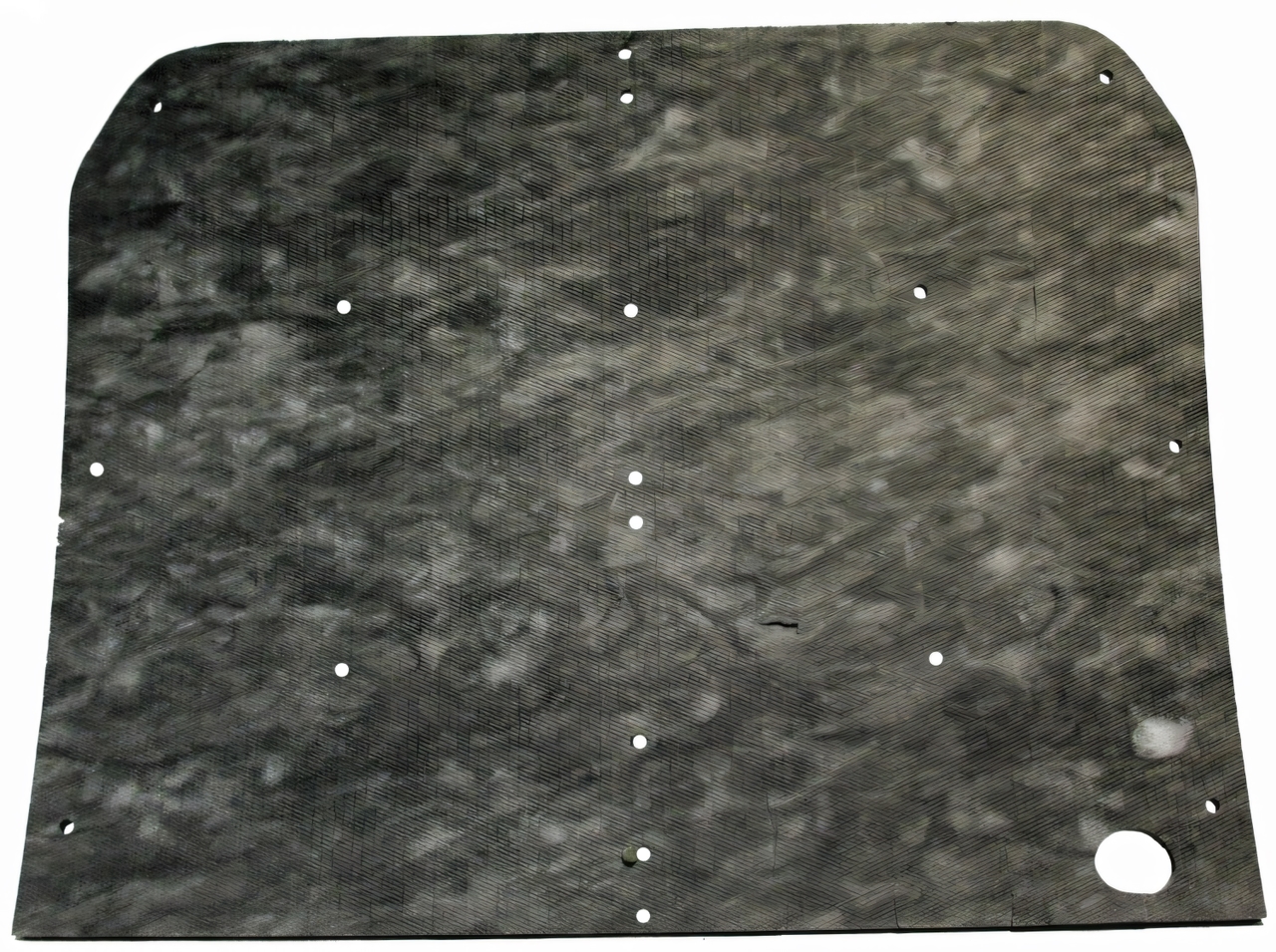 This fiberglass Heat Shield is precision-cut from original hood insulation, offering protection from engine heat and noise reduction while maintaining an authentic look. Made in the US, it ensures durability and a perfect fit for your restoration project.
