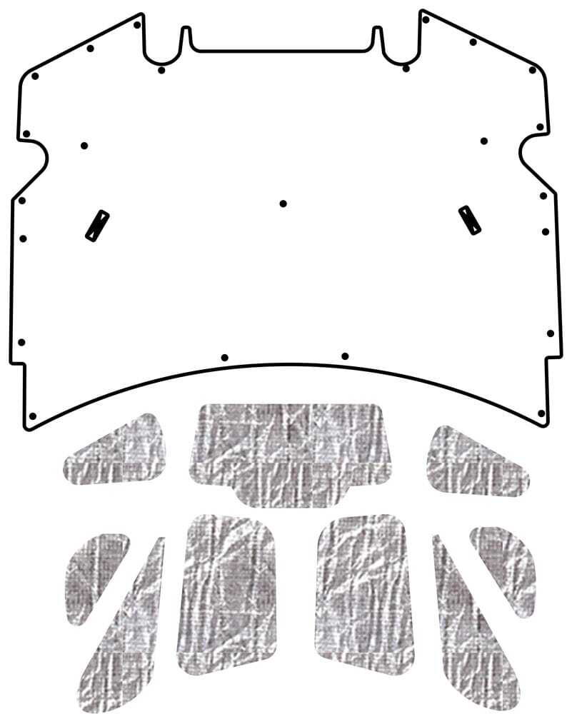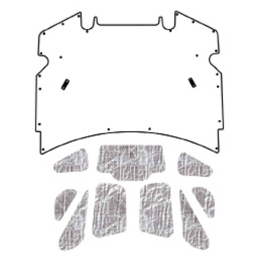 The kit includes a pre-cut A.B.S. hood panel, heat shield insulation panels, mounting pins, spray adhesive, seam tape, and detailed installation instructions for your convenience.