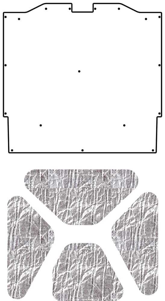 This hood insulation pad is made from black leather grain ABS plastic combined with foil-backed jute insulation, offering durability and effective thermal barrier properties.