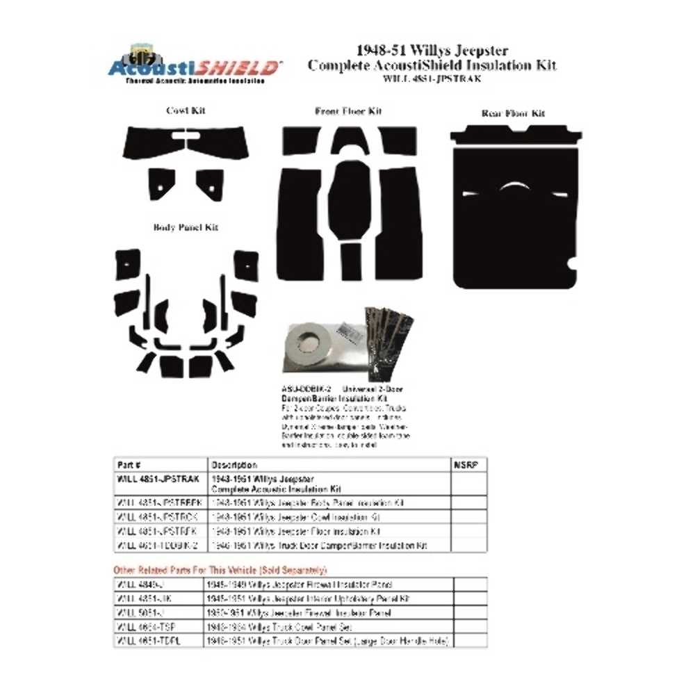 Enhance your 1948-51 Willys Jeepster with our Complete Insulation Sound Deadener Kit, designed specifically for classic car restoration. Made from high-quality foil backed jute insulation and sound dampening butyl strips, this kit provides exceptional noise reduction and thermal barrier benefits, ensuring a quieter and more comfortable ride. Experience the difference with our Insulation Sound Deadener for 1948-51 WILLYS JEEPSTER.