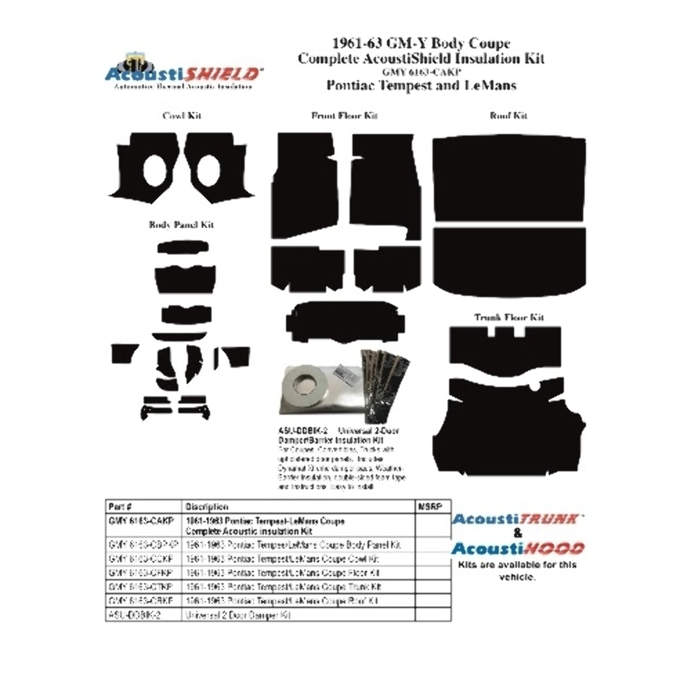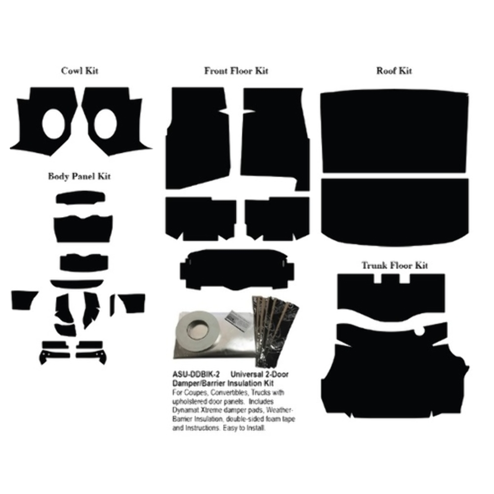 The kit includes floor insulation, cowl insulation, trunk insulation, body panel insulation, roof insulation, and door damper/barrier shields, providing comprehensive coverage for your vehicle.