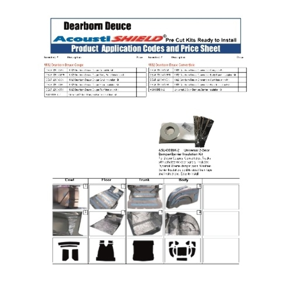 Enhance your 1932 Dearborn Deuce with our Complete Insulation Sound Deadener Kit, designed specifically for classic car restoration. Made from high-quality foil backed jute insulation, this kit provides exceptional noise reduction and thermal barrier benefits, ensuring a quieter and more comfortable ride. Upgrade your vehicle's interior with our premium sound deadener, tailored for the classic car enthusiast.