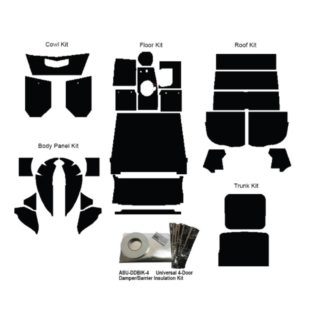 The kit includes floor insulation, roof insulation, cowl insulation, body panel insulation, trunk insulation, and a 4-D damper/barrier shield.
