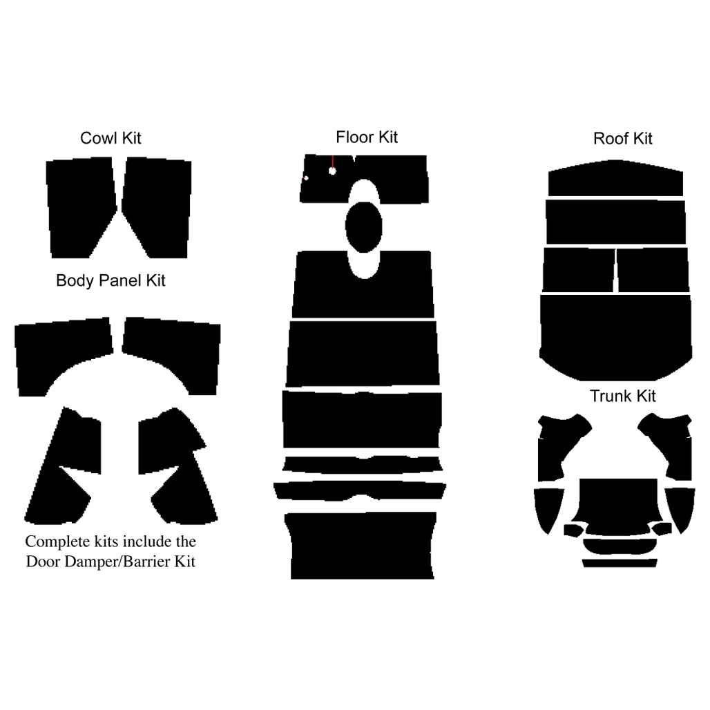 The kit includes floor insulation, roof insulation, cowl insulation, body panel insulation, trunk insulation, and door damper/barrier shields, offering comprehensive coverage for your vehicle.