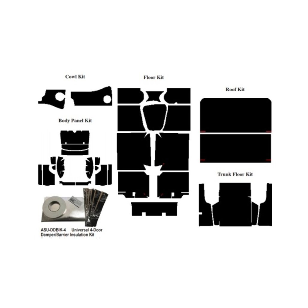 The kit includes floor insulation, trunk insulation, cowl insulation, roof insulation, body panel insulation, and a door damper/barrier shield (4-D) for comprehensive coverage.