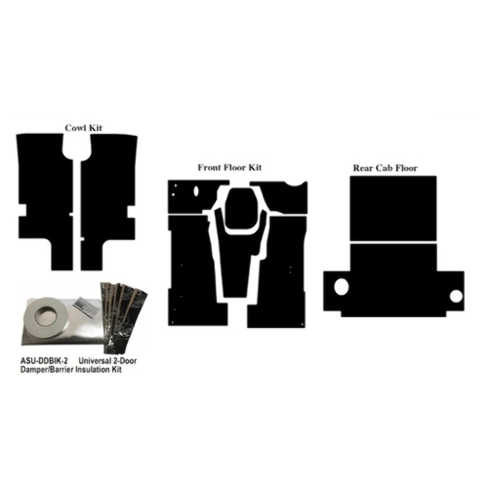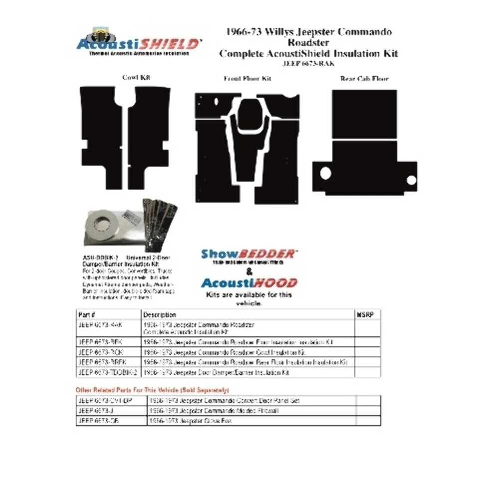 The kit includes all necessary materials for complete installation, including foil backed jute insulation and sound dampening butyl strips tailored for your Jeepster Commando.
