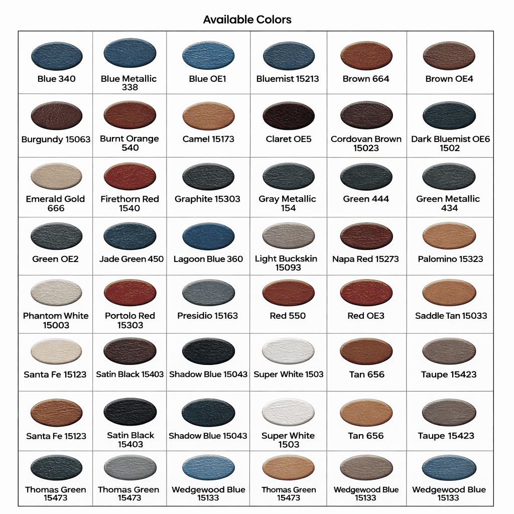 This interior door arm rest skin overlay is available in 33 colors including Black, Super White, Saddle Tan, Burgundy, and more. Select the color that best matches your interior.