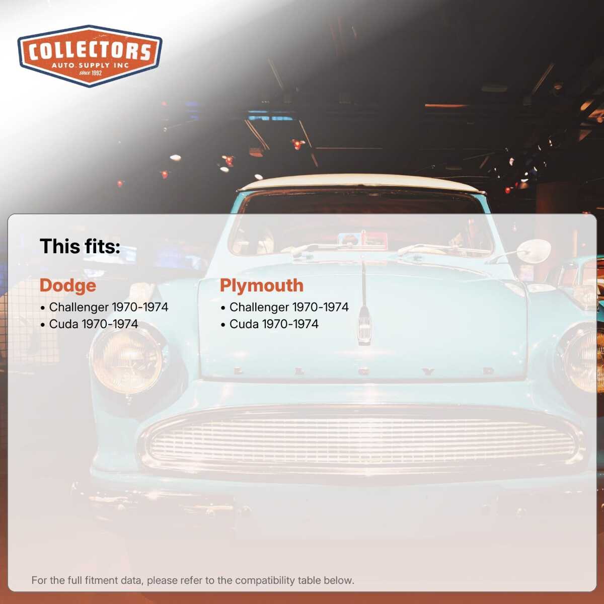 You can purchase this product directly from Collectors Auto Supply, where we specialize in classic car restoration parts and accessories. Finding the perfect part for your classic car can be difficult, and even frustrating. And let us be honest. What makes it worse is a general lack of customer love in the industry. That is why we are here, and that is why we are different. We are car people just like you, and we know what you need. And if we do not already know it, we're listening. So, contact us if you need help finding a part, or have an idea for how to improve our website, or anything else. Or if you want to do it the old-fashioned way, give us a call at 1 (800) 414-4462.