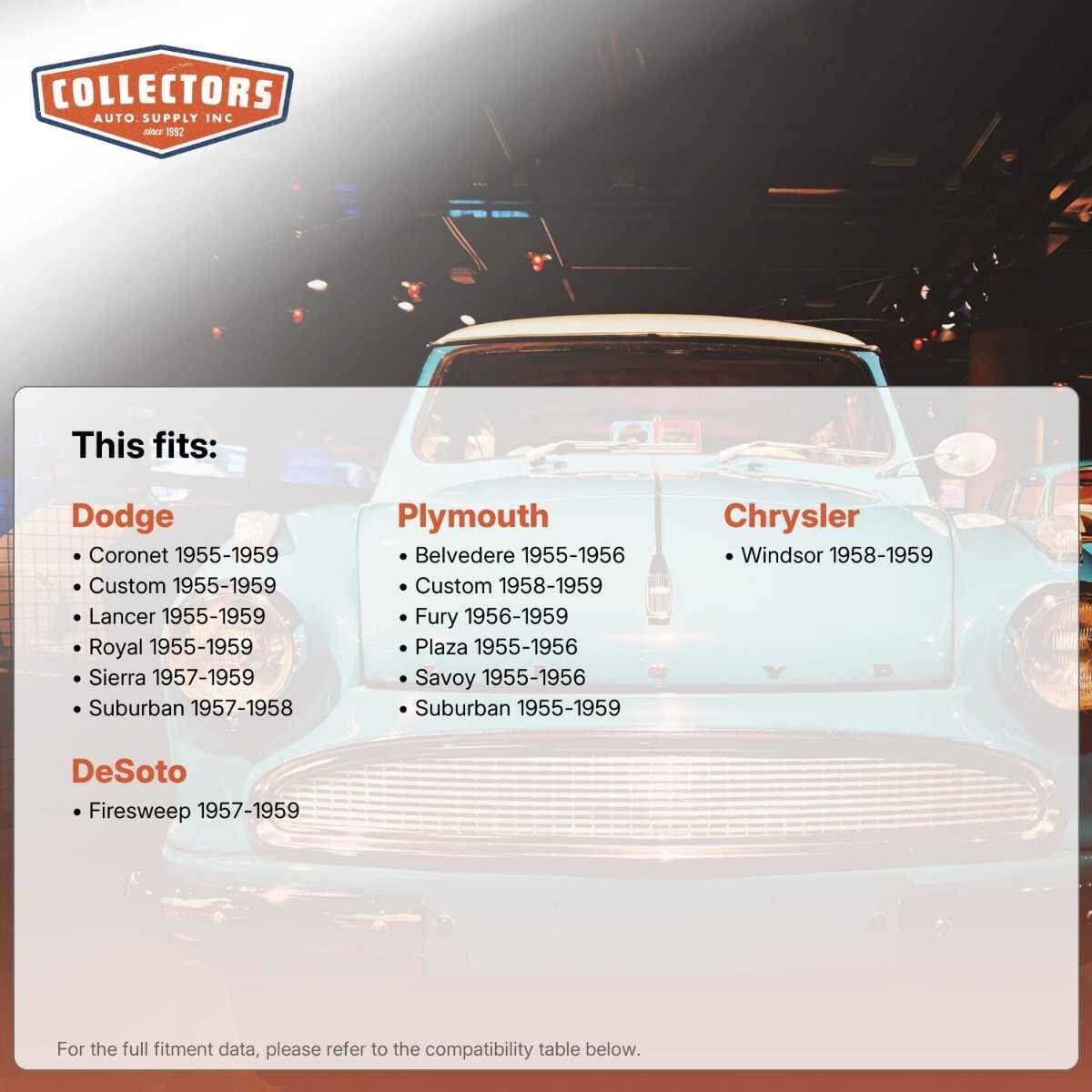 This auto part is covered by Collectors Auto Supply's three-dimensional promise — you'll get the right part the first time, you can talk to us, and with over 25 years in business and 100,000+ customer transactions, you can trust us to be the right choice to fuel your passion.