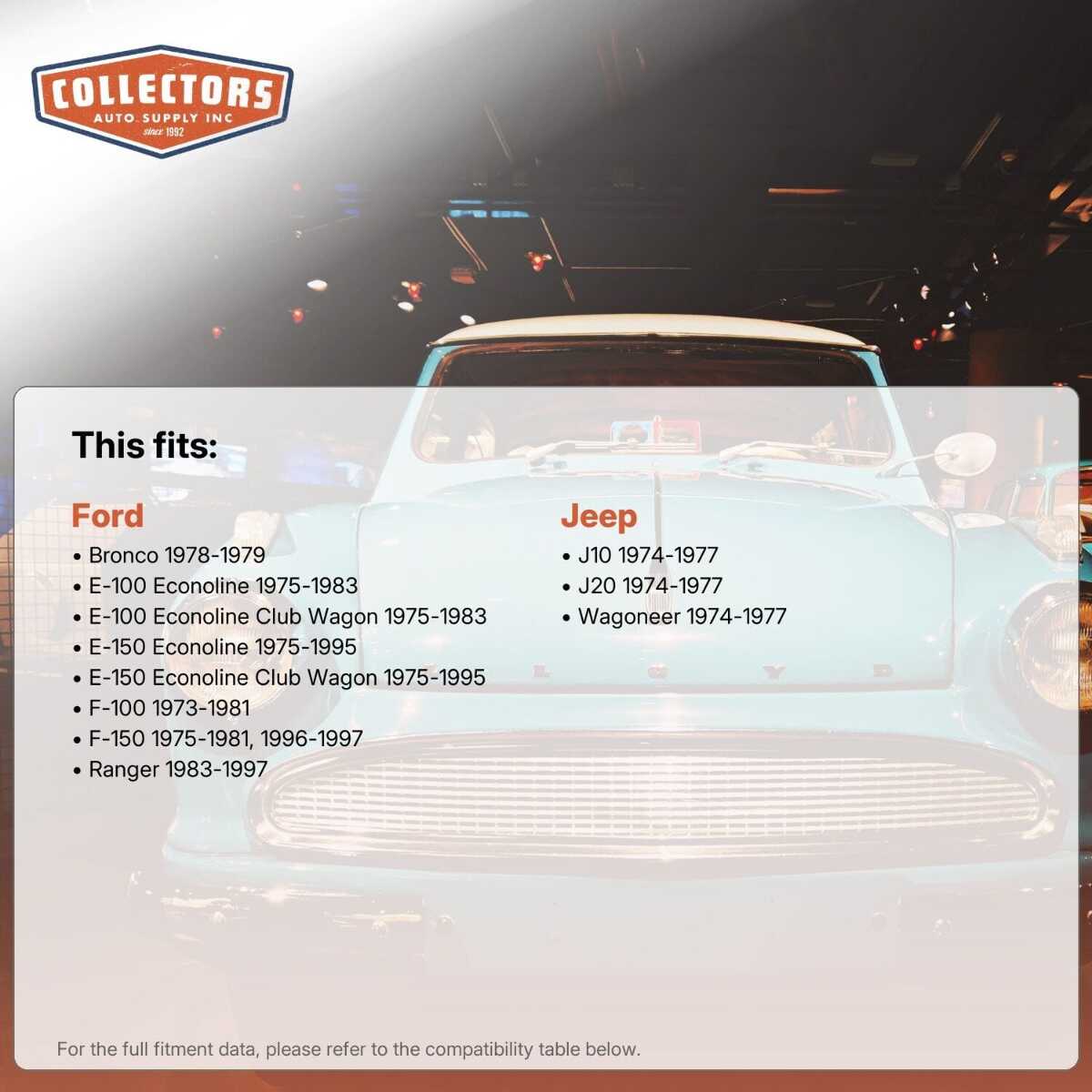 This auto part is covered by Collectors Auto Supply's three-dimensional promise — you'll get the right part the first time, you can talk to us, and with over 25 years in business and 100,000+ customer transactions, you can trust us to be the right choice to fuel your passion.