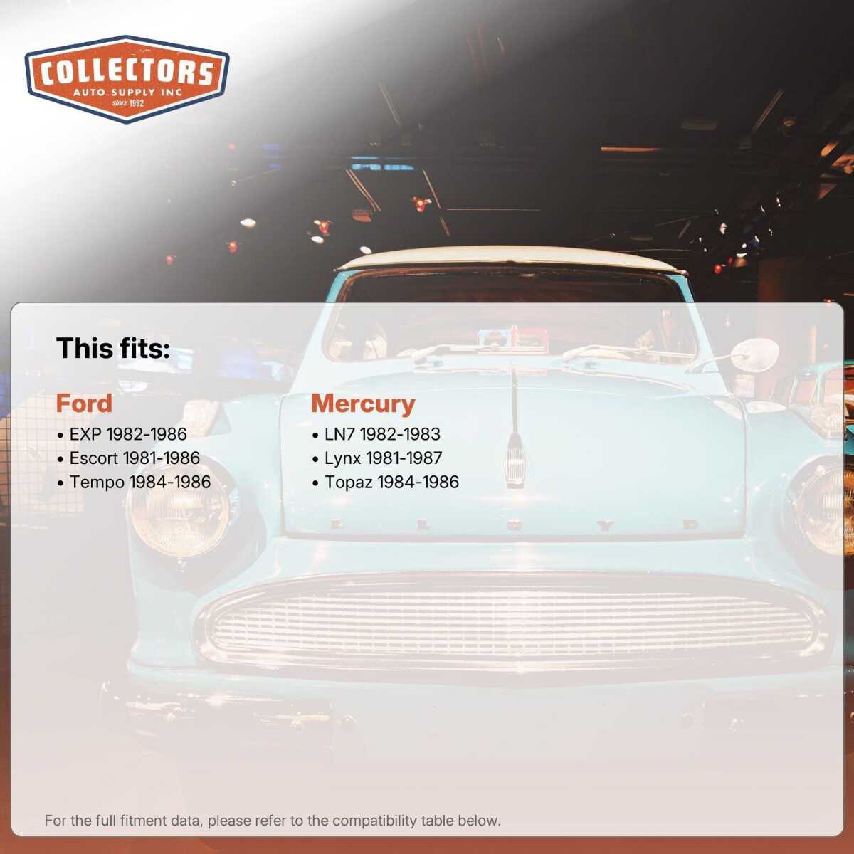 This auto part is covered by Collectors Auto Supply's three-dimensional promise — you'll get the right part the first time, you can talk to us, and with over 25 years in business and 100,000+ customer transactions, you can trust us to be the right choice to fuel your passion.
