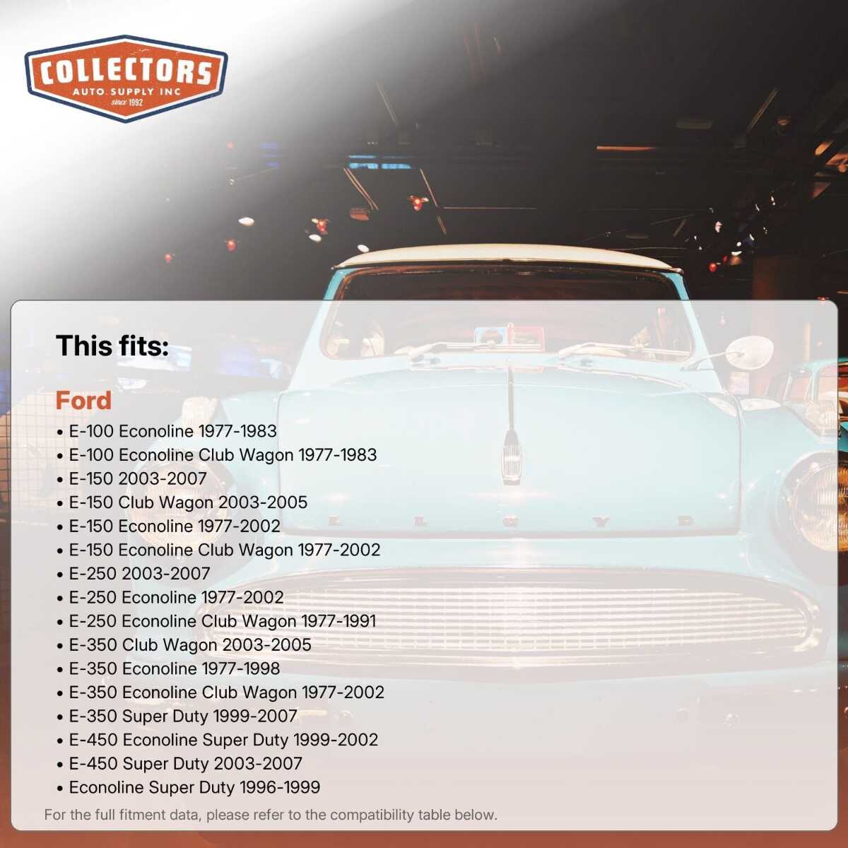 You can purchase this product directly from Collectors Auto Supply, where we specialize in classic car restoration parts and accessories. Finding the perfect part for your classic car can be difficult, and even frustrating. And let us be honest. What makes it worse is a general lack of customer love in the industry. That is why we are here, and that is why we are different. We are car people just like you, and we know what you need. And if we do not already know it, we're listening. So, contact us if you need help finding a part, or have an idea for how to improve our website, or anything else. Or if you want to do it the old-fashioned way, give us a call at 1 (800) 414-4462.