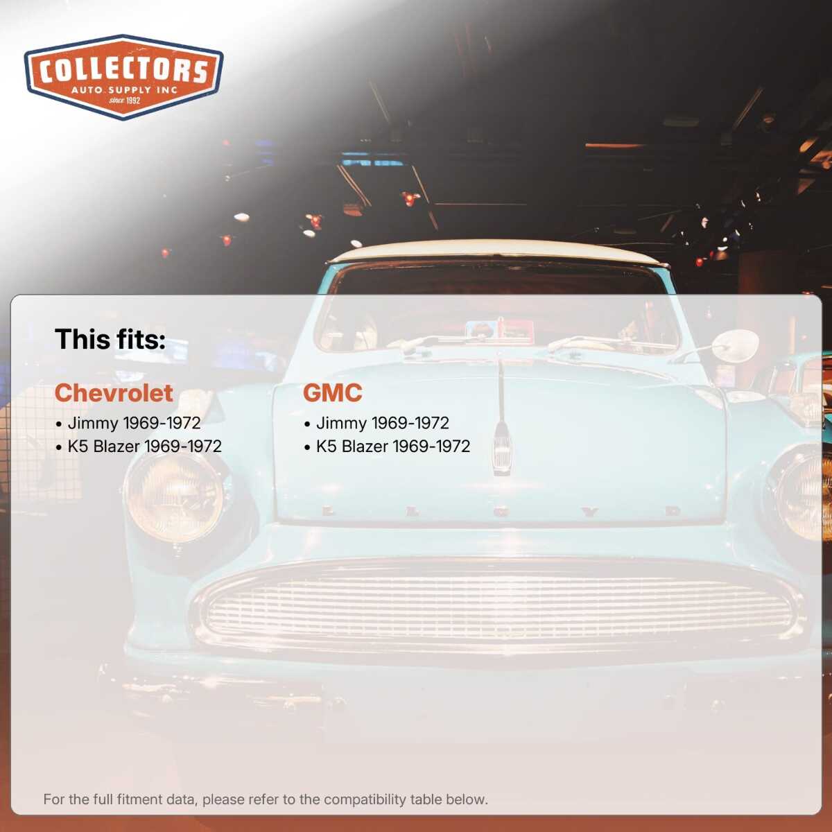 You can purchase this product directly from Collectors Auto Supply, where we specialize in classic car restoration parts and accessories. Finding the perfect part for your classic car can be difficult, and even frustrating. And let us be honest. What makes it worse is a general lack of customer love in the industry. That is why we are here, and that is why we are different. We are car people just like you, and we know what you need. And if we do not already know it, we're listening. So, contact us if you need help finding a part, or have an idea for how to improve our website, or anything else. Or if you want to do it the old-fashioned way, give us a call at 1 (800) 414-4462.