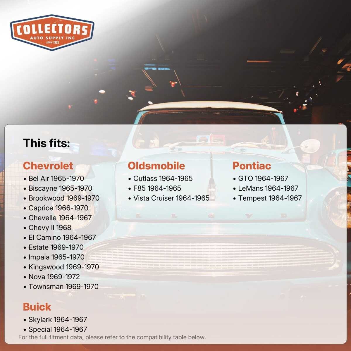 You can purchase this product directly from Collectors Auto Supply, where we specialize in classic car restoration parts and accessories. Finding the perfect part for your classic car can be difficult, and even frustrating. And let us be honest. What makes it worse is a general lack of customer love in the industry. That is why we are here, and that is why we are different. We are car people just like you, and we know what you need. And if we do not already know it, we're listening. So, contact us if you need help finding a part, or have an idea for how to improve our website, or anything else. Or if you want to do it the old-fashioned way, give us a call at 1 (800) 414-4462.
