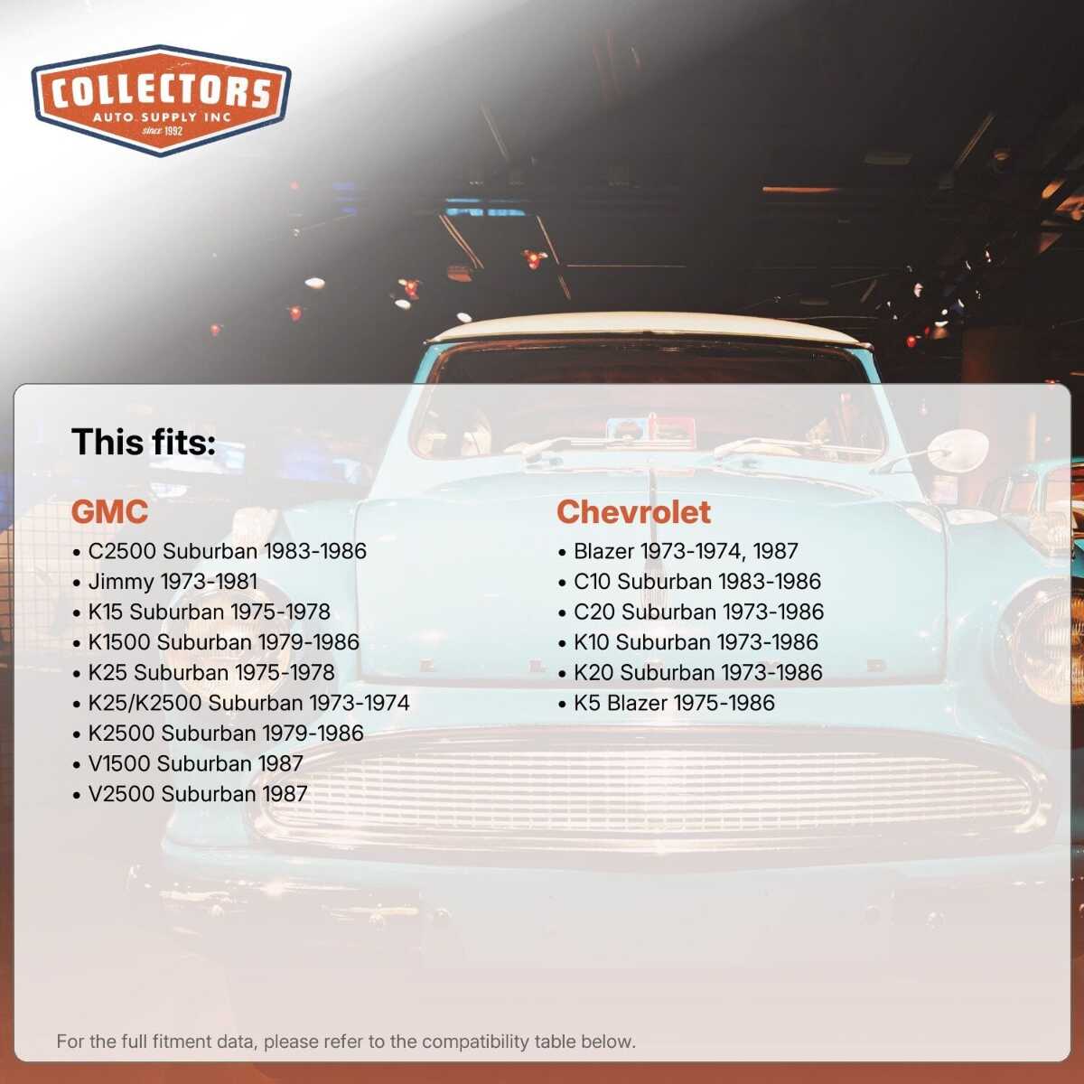 You can purchase this product directly from Collectors Auto Supply, where we specialize in classic car restoration parts and accessories. Finding the perfect part for your classic car can be difficult, and even frustrating. And let us be honest. What makes it worse is a general lack of customer love in the industry. That is why we are here, and that is why we are different. We are car people just like you, and we know what you need. And if we do not already know it, we're listening. So, contact us if you need help finding a part, or have an idea for how to improve our website, or anything else. Or if you want to do it the old-fashioned way, give us a call at 1 (800) 414-4462.