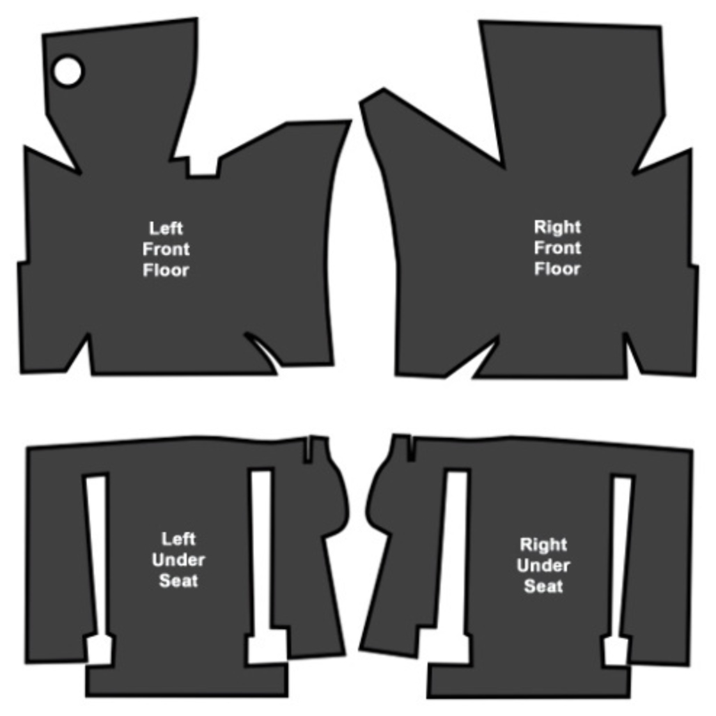 This carpet covers the Front area of the vehicle. This kit will arrive in 4 pieces, with all the edges trimmed and surging complete.