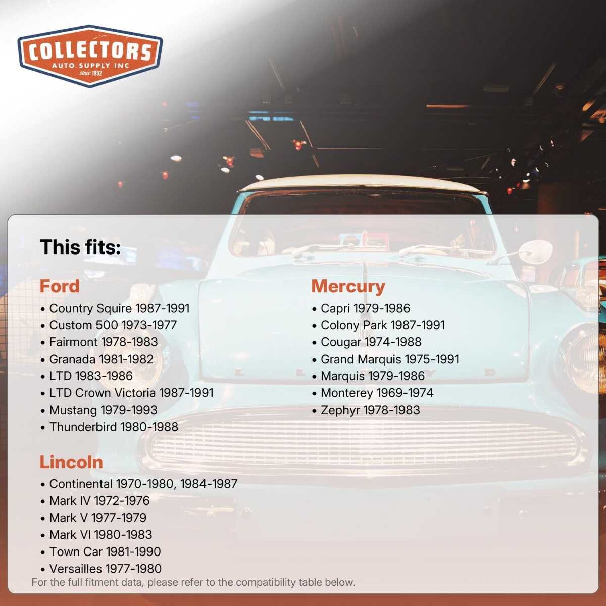 This auto part is covered by Collector's Auto Supply's three-dimensional promiseÑyou'll get the right part the first time, you can talk to us; and with over 25 years in business and 100,000+ customer transactions, you can trust us to be the right choice to fuel your passion.