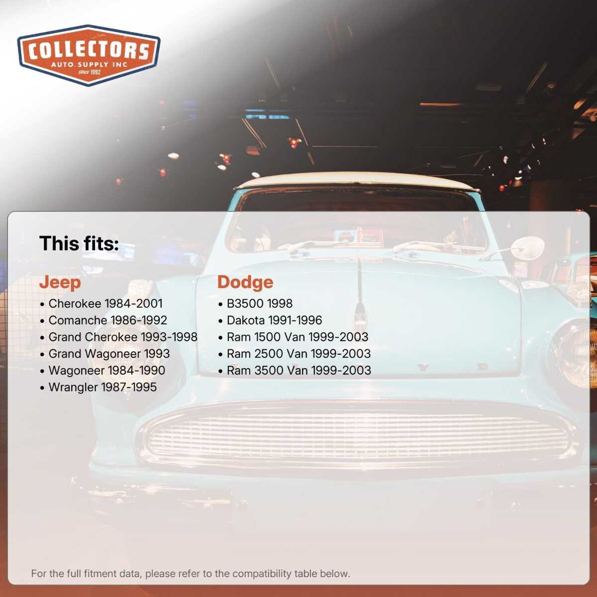 This auto part is covered by Collector's Auto Supply's three-dimensional promiseÑyou'll get the right part the first time, you can talk to us; and with over 25 years in business and 100,000+ customer transactions, you can trust us to be the right choice to fuel your passion.