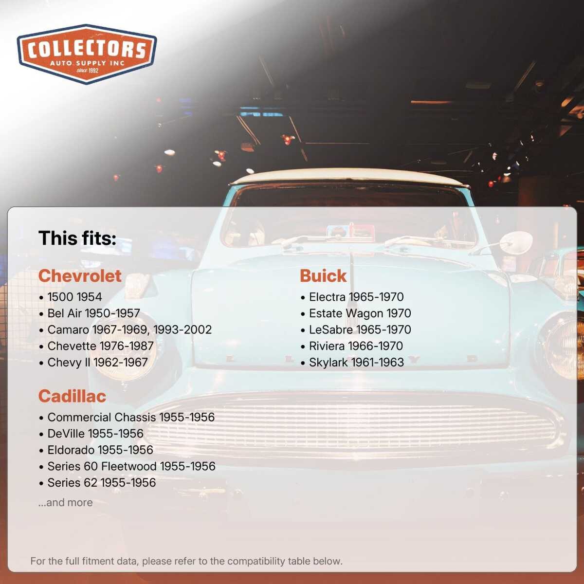 This auto part is covered by Collectors Auto Supply's three-dimensional promise — you'll get the right part the first time, you can talk to us, and with over 25 years in business and 100,000+ customer transactions, you can trust us to be the right choice to fuel your passion.