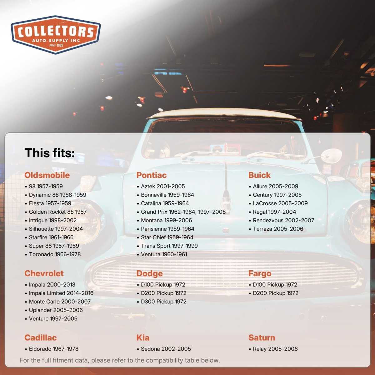 This auto part is covered by Collectors Auto Supply's three-dimensional promise — you'll get the right part the first time, you can talk to us, and with over 25 years in business and 100,000+ customer transactions, you can trust us to be the right choice to fuel your passion.