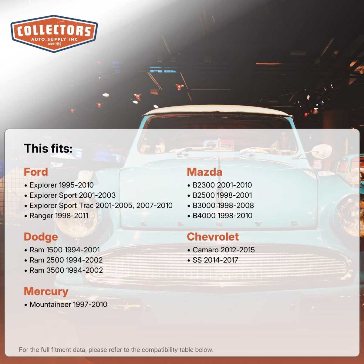 This auto part is covered by Collectors Auto Supply's three-dimensional promise — you'll get the right part the first time, you can talk to us, and with over 25 years in business and 100,000+ customer transactions, you can trust us to be the right choice to fuel your passion.