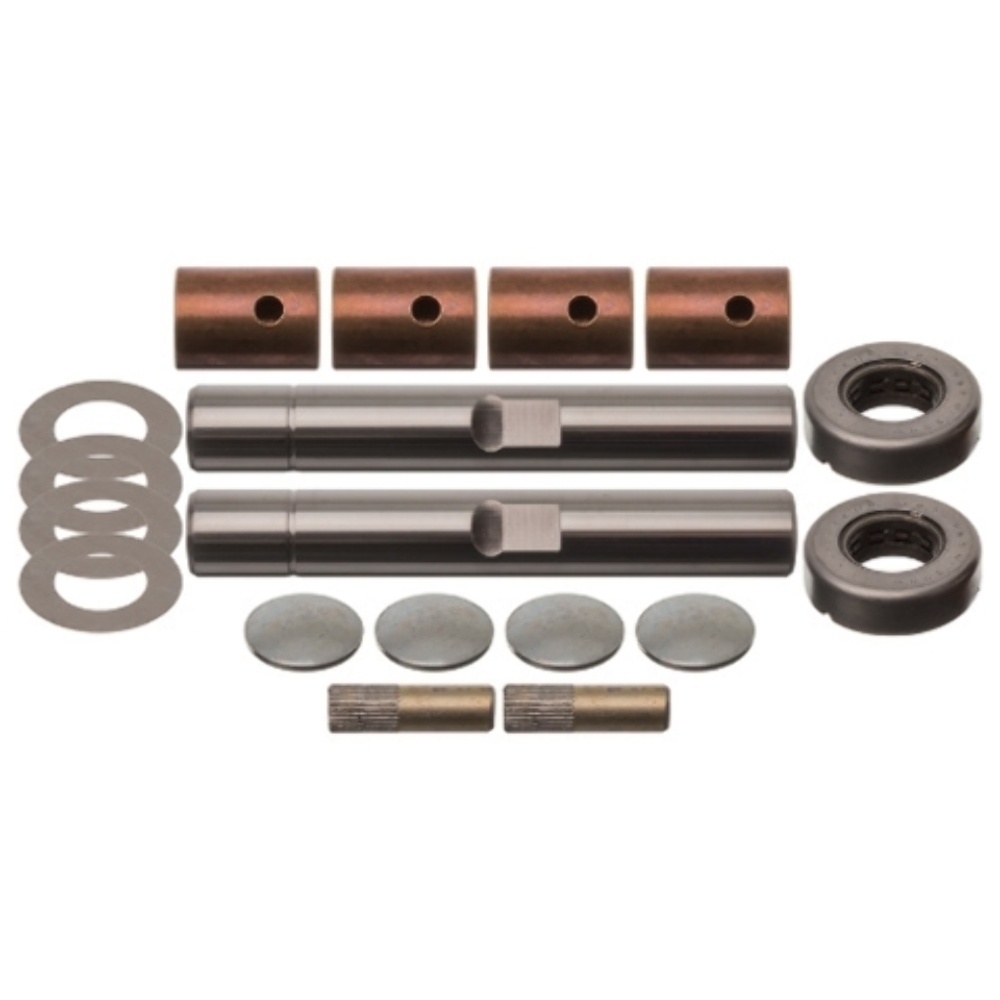 Most king pin sets include the pins, bushings, bearings, seals, and hardware needed for a complete rebuild. Verify kit contents in the product details.