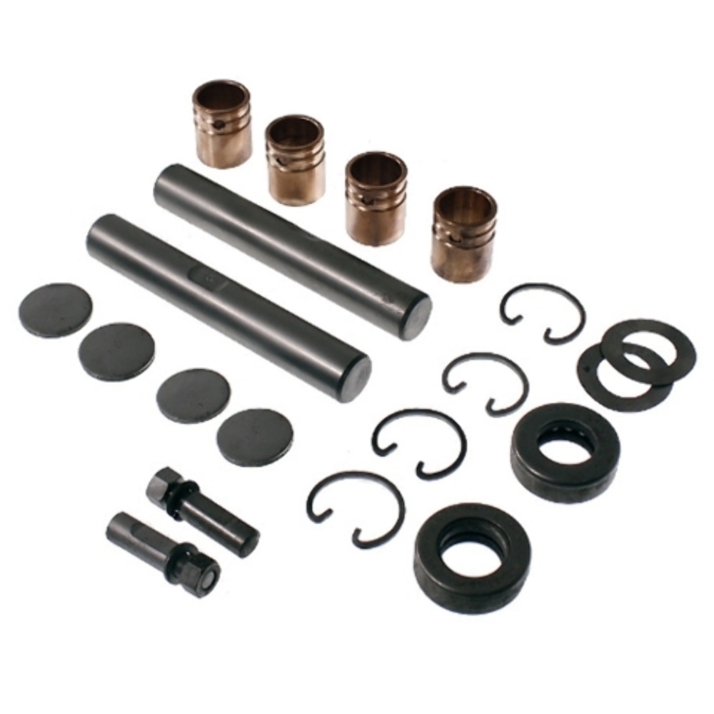 Most king pin sets include the pins, bushings, bearings, seals, and hardware needed for a complete rebuild. Verify kit contents in the product details.