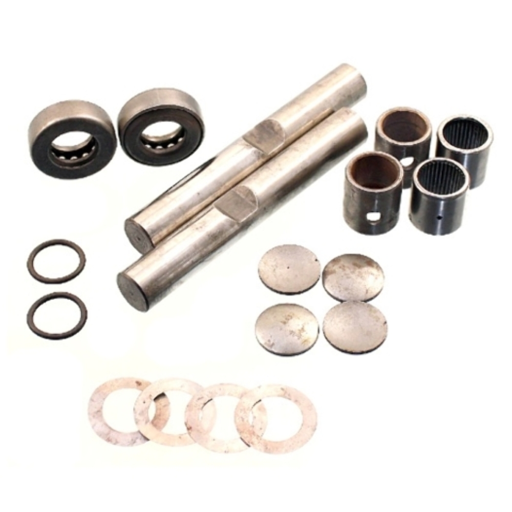 Most king pin sets include the pins, bushings, bearings, seals, and hardware needed for a complete rebuild. Verify kit contents in the product details.