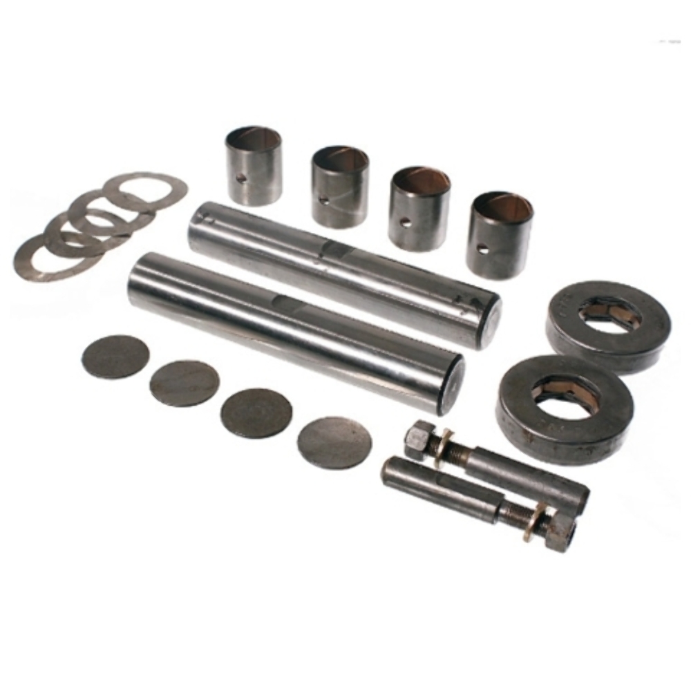 Package Contents: 2 King Pins, 4 Bushings, 2 Bearings, 4 Welch Plugs, 2 Threaded Lock Pins, 2 Lock Washers, 2 Nuts, Asst Shims
