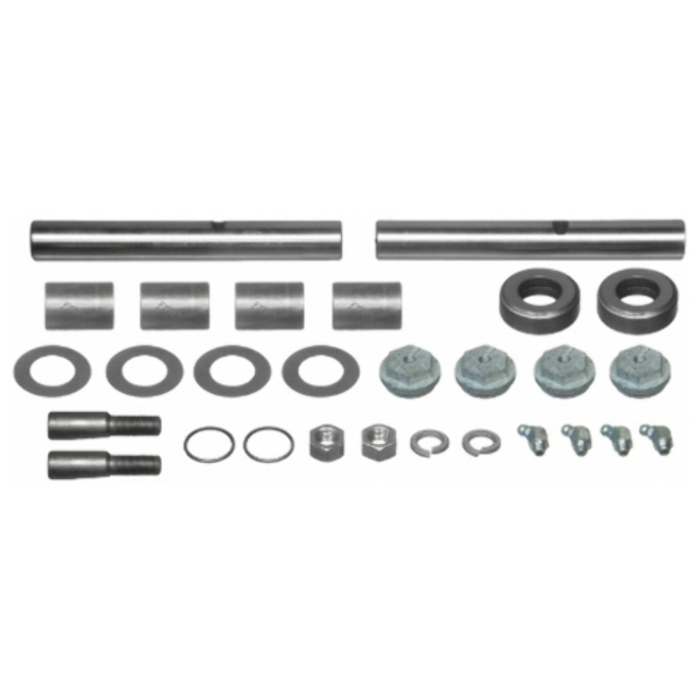 Most king pin sets include the pins, bushings, bearings, seals, and hardware needed for a complete rebuild. Verify kit contents in the product details.