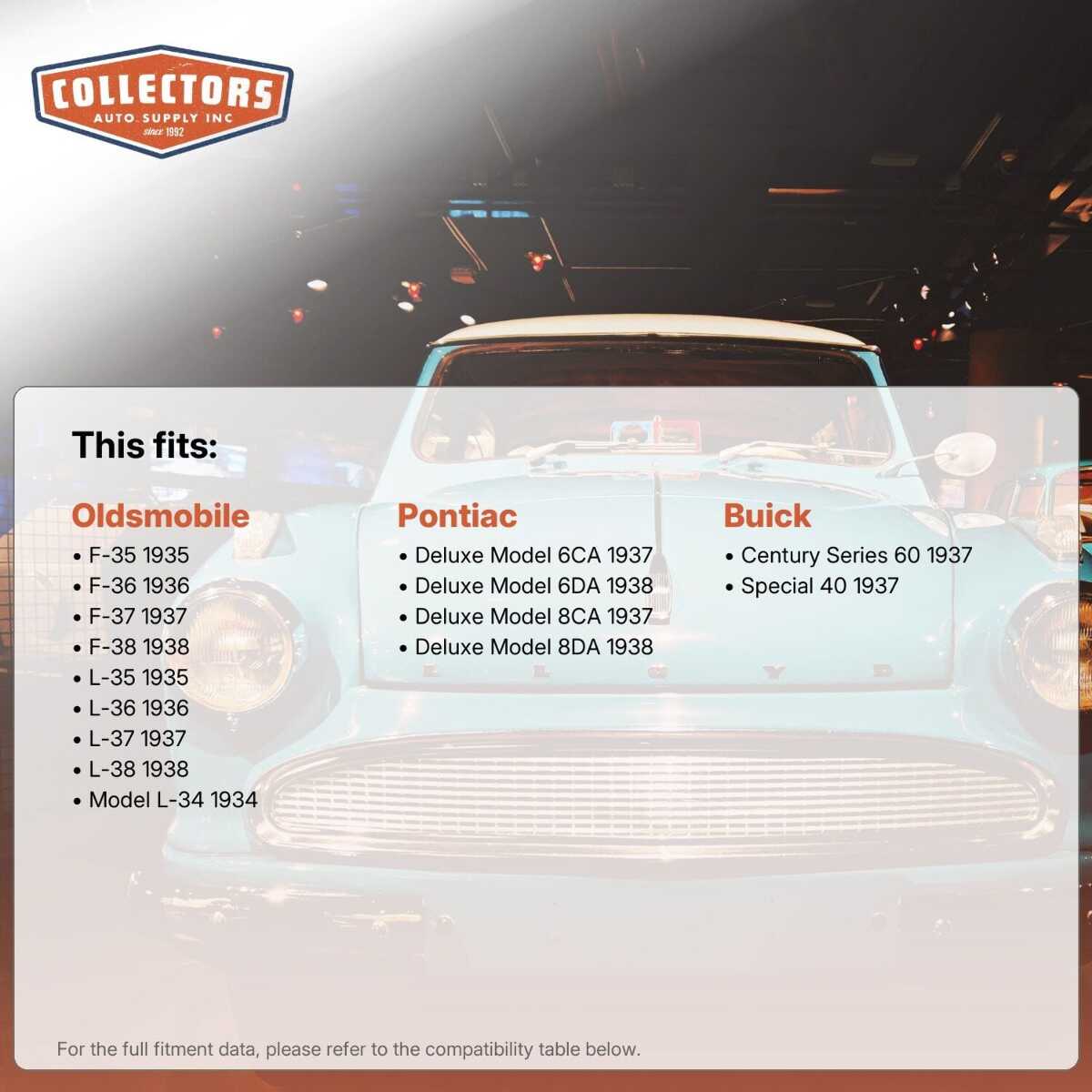 This auto part is covered by Collectors Auto Supply's three-dimensional promise — you'll get the right part the first time, you can talk to us, and with over 25 years in business and 100,000+ customer transactions, you can trust us to be the right choice to fuel your passion.