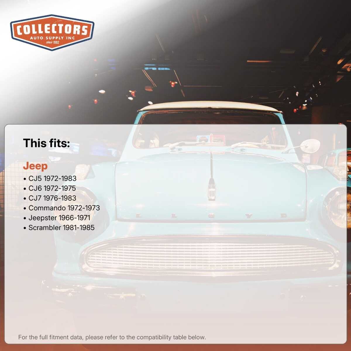 This auto part is covered by Collectors Auto Supply's three-dimensional promise — you'll get the right part the first time, you can talk to us, and with over 25 years in business and 100,000+ customer transactions, you can trust us to be the right choice to fuel your passion.