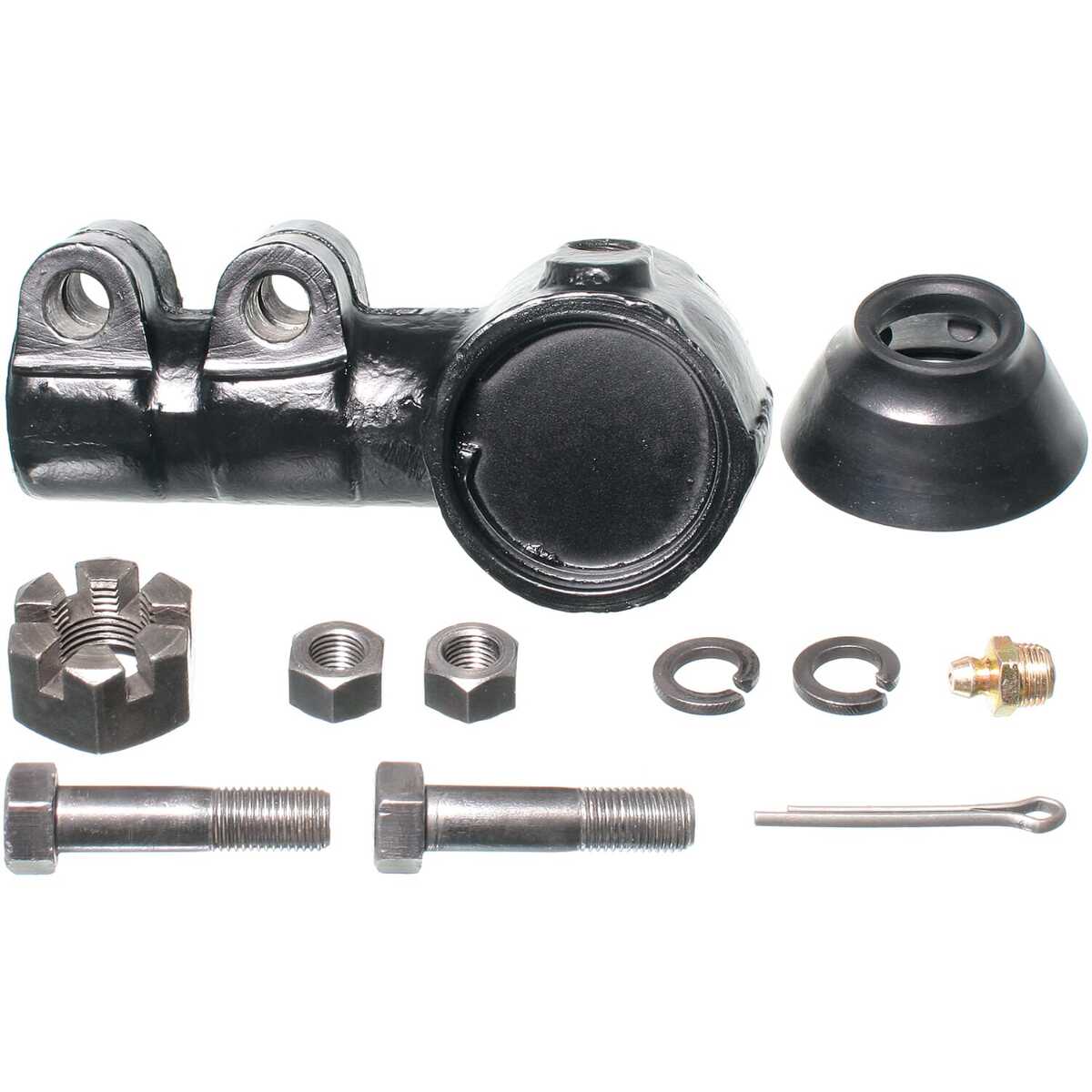 Package Contents: 1 Tie Rod End, 1 Dust Boot, 1 Castle Nut, 1 Cotter Pin, 2 Bolts, 2 Nuts, 2 Lock Washers, 1 Grease Fitting