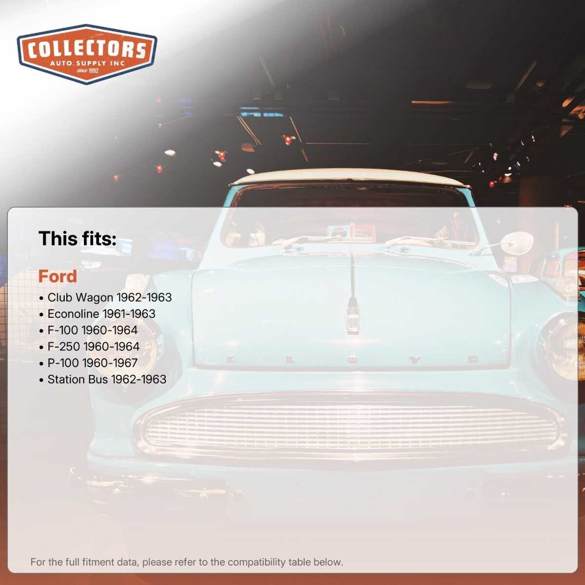 This auto part is covered by Collectors Auto Supply's three-dimensional promise — you'll get the right part the first time, you can talk to us, and with over 25 years in business and 100,000+ customer transactions, you can trust us to be the right choice to fuel your passion.