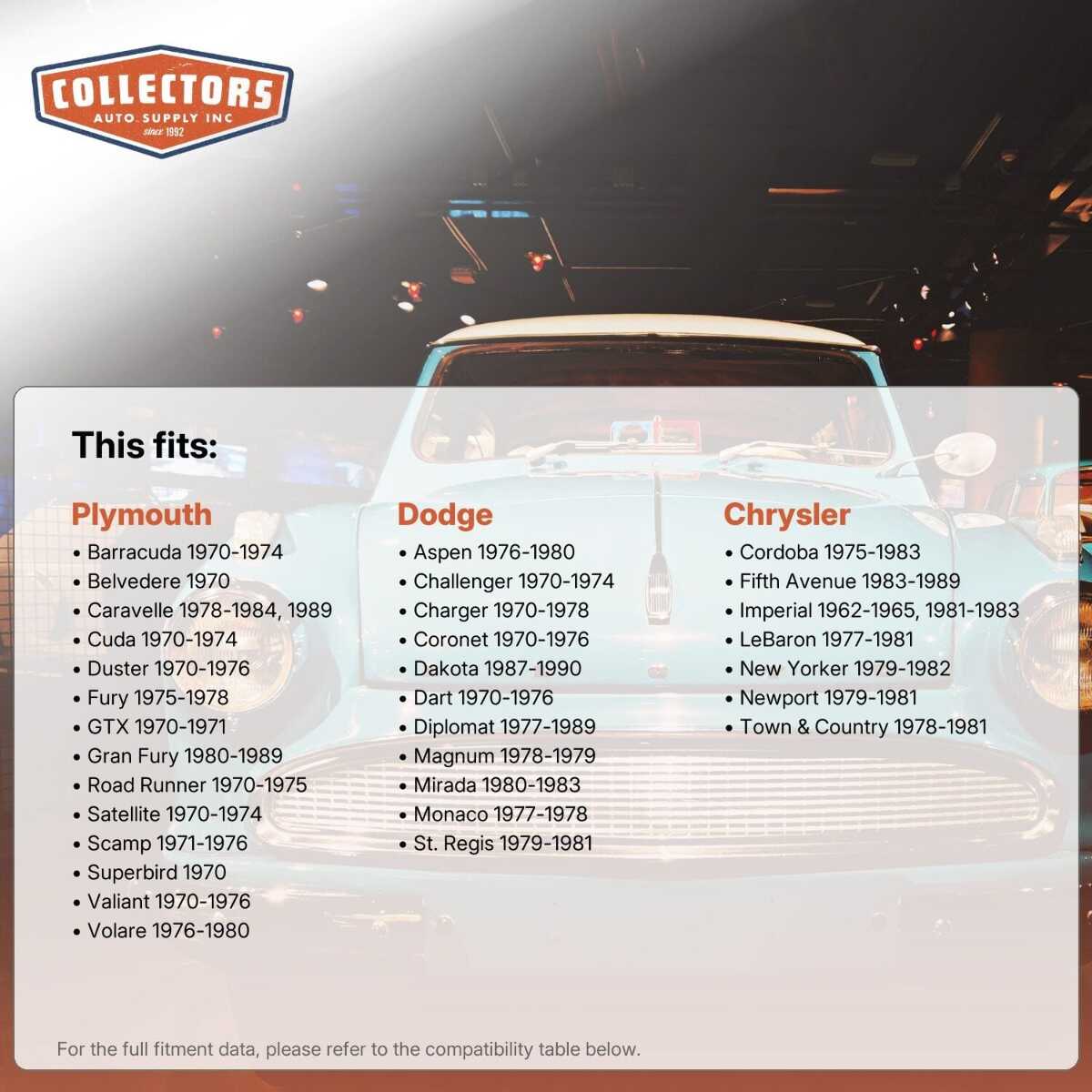 Collectors Auto Supply offers premium replacement auto parts and the experience to get you the right parts for your vehicle. Our group of experts has a combined knowledge of more than a half-century specializing in classic restoration components. Together, we’ve been making old rides new again for more than 25 years.