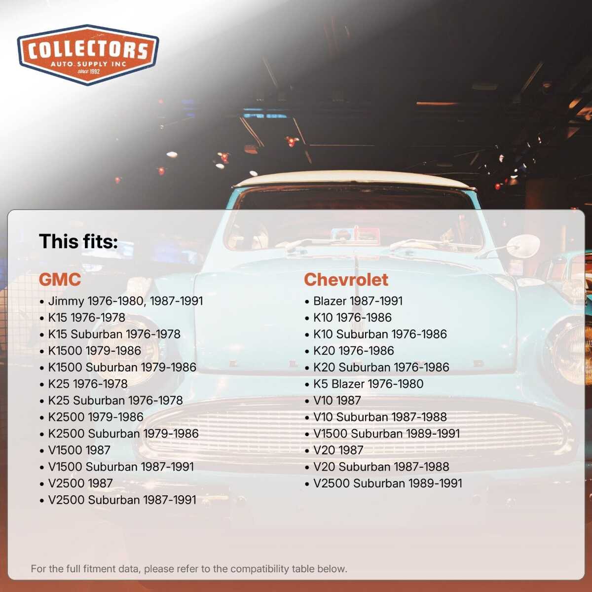 You can purchase this product directly from Collectors Auto Supply, where we specialize in classic car restoration parts and accessories. Finding the perfect part for your classic car can be difficult, and even frustrating. And let us be honest. What makes it worse is a general lack of customer love in the industry. That is why we are here, and that is why we are different. We are car people just like you, and we know what you need. And if we do not already know it, we're listening. So, contact us if you need help finding a part, or have an idea for how to improve our website, or anything else. Or if you want to do it the old-fashioned way, give us a call at 1 (800) 414-4462.