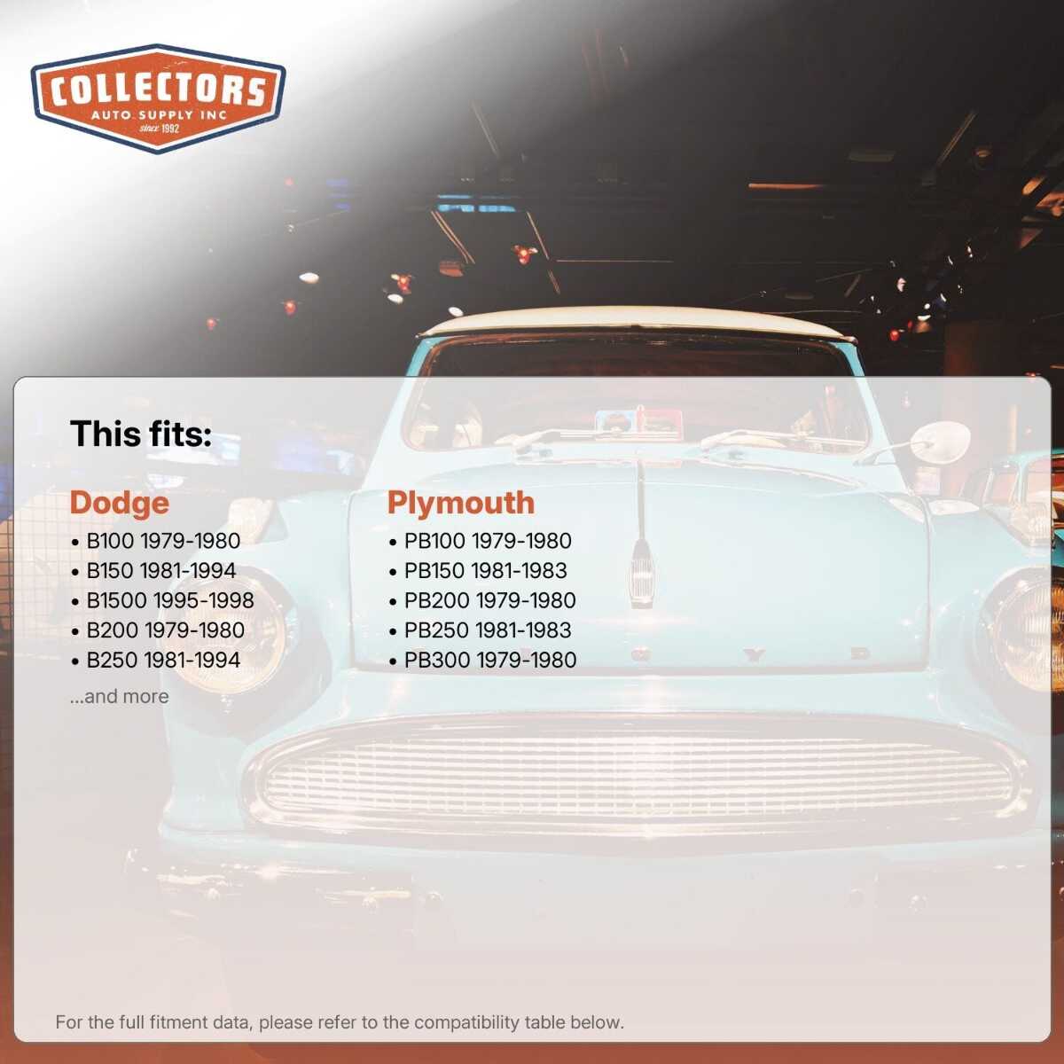 You can purchase this product directly from Collectors Auto Supply, where we specialize in classic car restoration parts and accessories. Finding the perfect part for your classic car can be difficult, and even frustrating. And let us be honest. What makes it worse is a general lack of customer love in the industry. That is why we are here, and that is why we are different. We are car people just like you, and we know what you need. And if we do not already know it, we're listening. So, contact us if you need help finding a part, or have an idea for how to improve our website, or anything else. Or if you want to do it the old-fashioned way, give us a call at 1 (800) 414-4462.