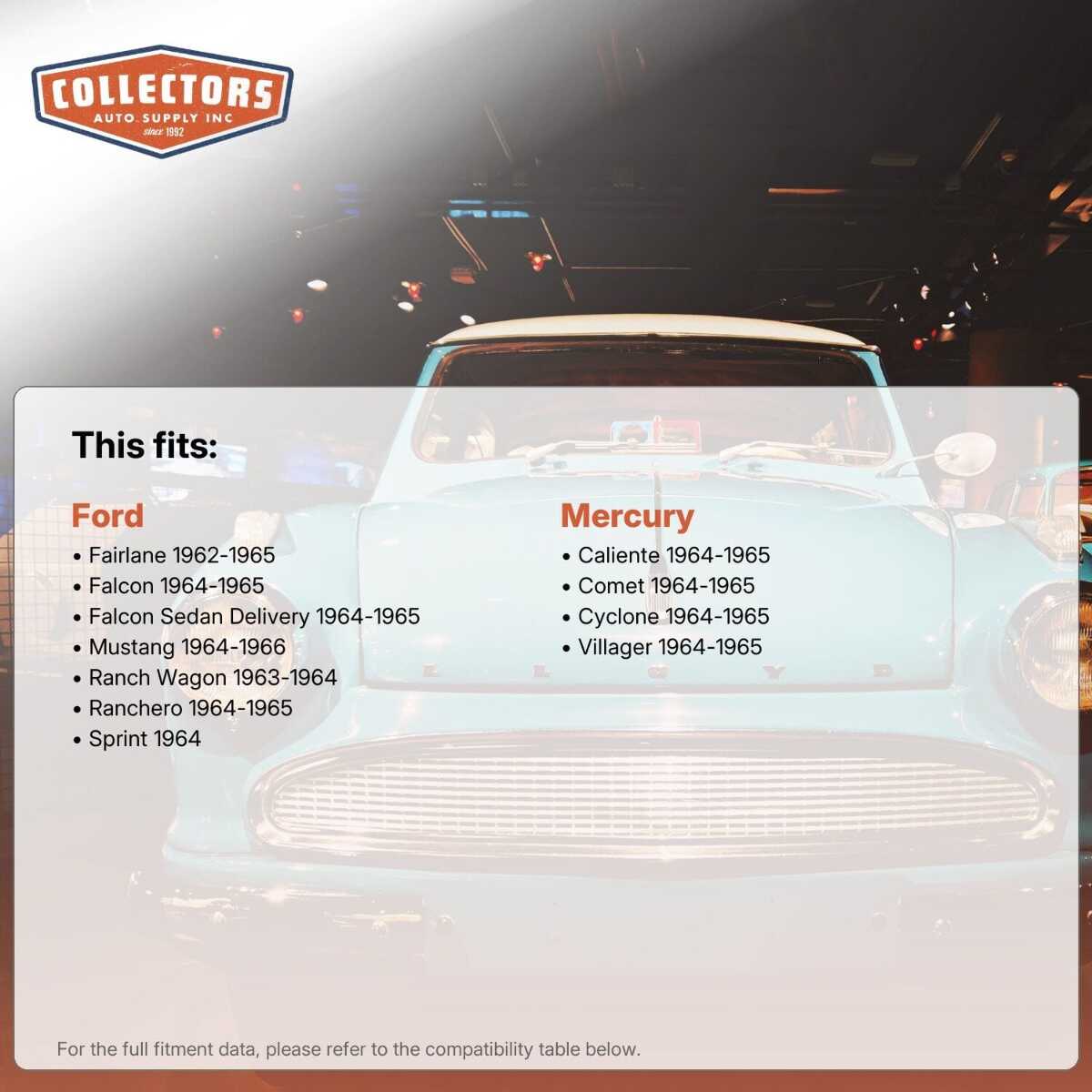You can purchase this product directly from Collectors Auto Supply, where we specialize in classic car restoration parts and accessories. Finding the perfect part for your classic car can be difficult, and even frustrating. And let us be honest. What makes it worse is a general lack of customer love in the industry. That is why we are here, and that is why we are different. We are car people just like you, and we know what you need. And if we do not already know it, we're listening. So, contact us if you need help finding a part, or have an idea for how to improve our website, or anything else. Or if you want to do it the old-fashioned way, give us a call at 1 (800) 414-4462.