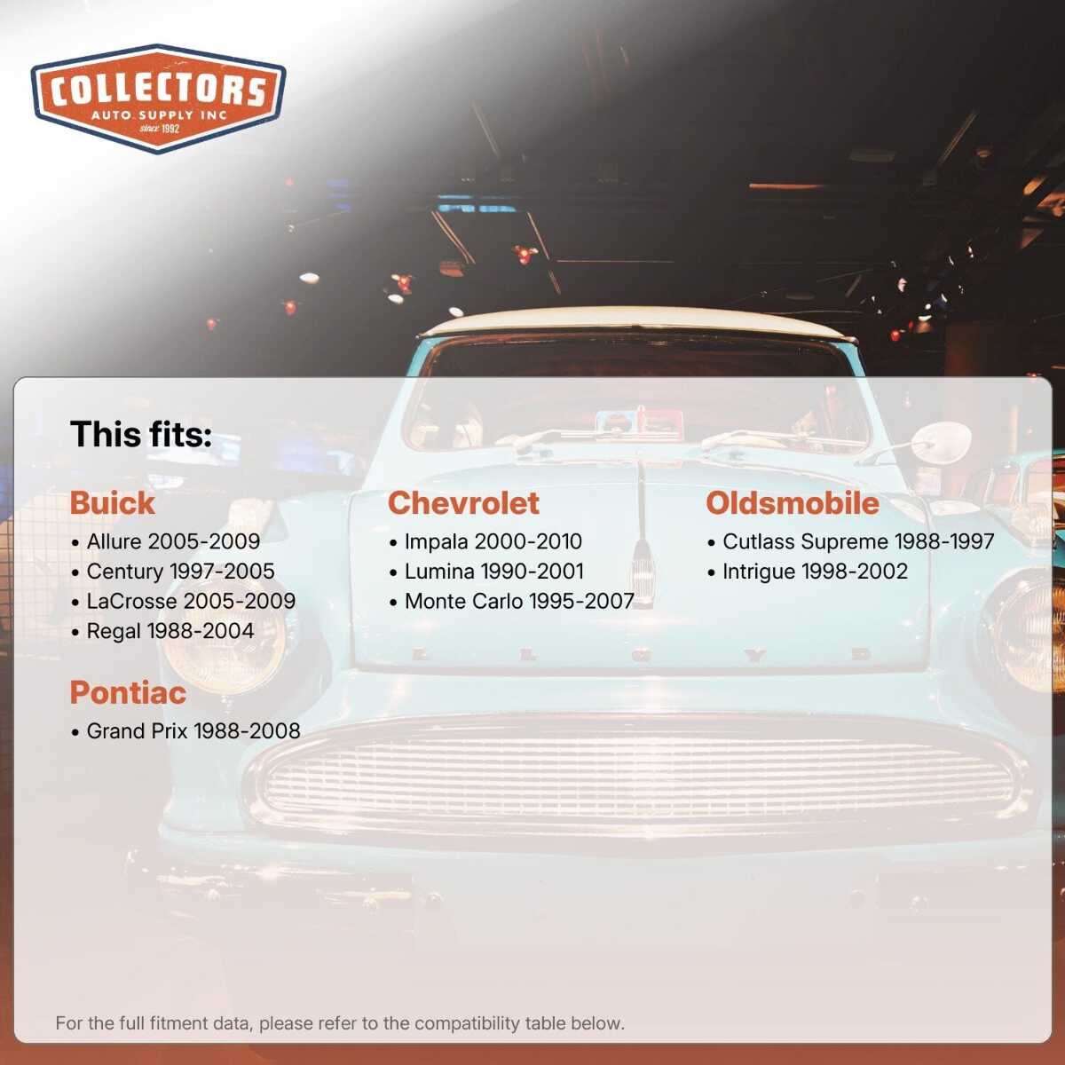 This auto part is covered by Collectors Auto Supply's three-dimensional promise — you'll get the right part the first time, you can talk to us, and with over 25 years in business and 100,000+ customer transactions, you can trust us to be the right choice to fuel your passion.