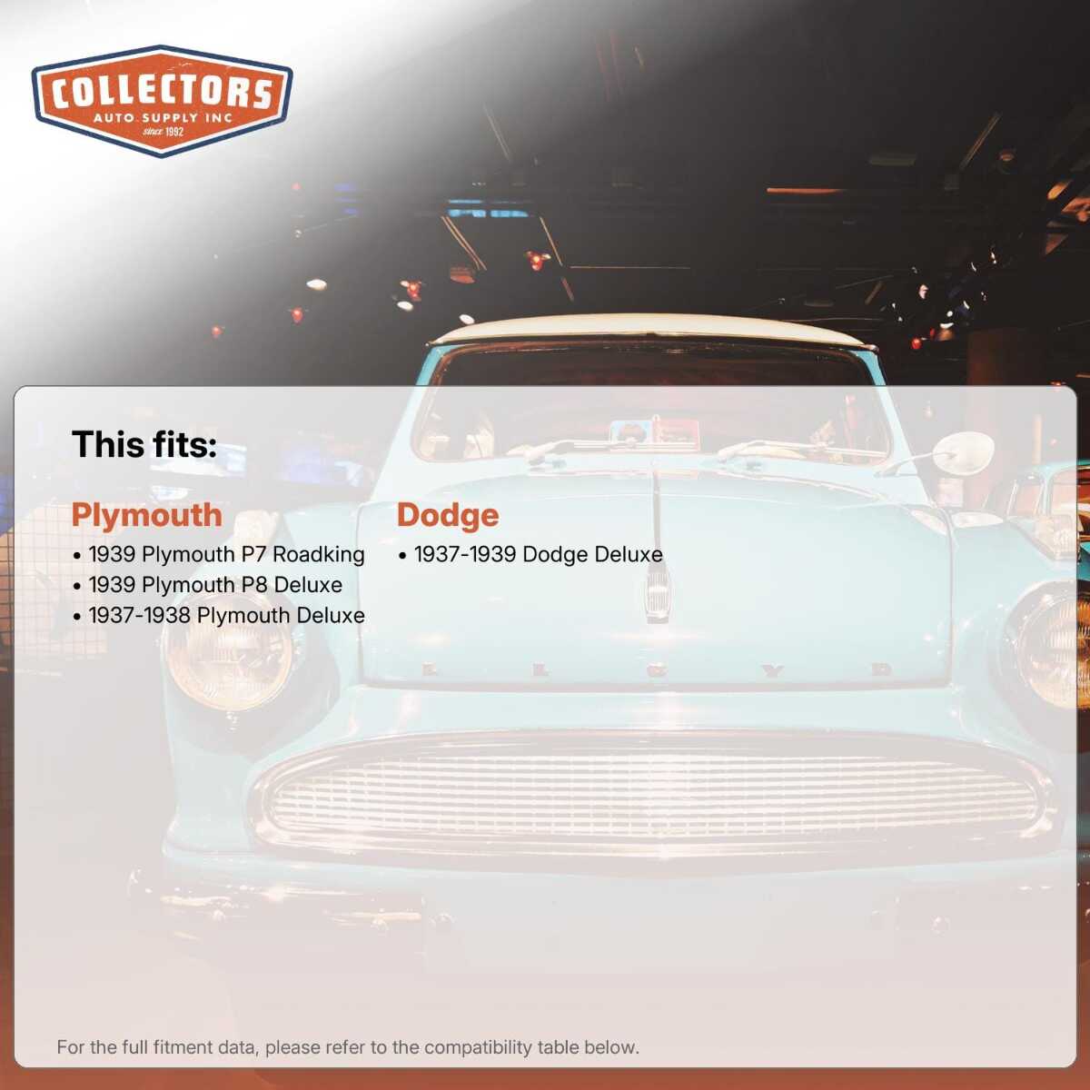 You can purchase this product directly from Collectors Auto Supply, where we specialize in classic car restoration parts and accessories. Finding the perfect part for your classic car can be difficult, and even frustrating. And let us be honest. What makes it worse is a general lack of customer love in the industry. That is why we are here, and that is why we are different. We are car people just like you, and we know what you need. And if we do not already know it, we're listening. So, contact us if you need help finding a part, or have an idea for how to improve our website, or anything else. Or if you want to do it the old-fashioned way, give us a call at 1 (800) 414-4462.