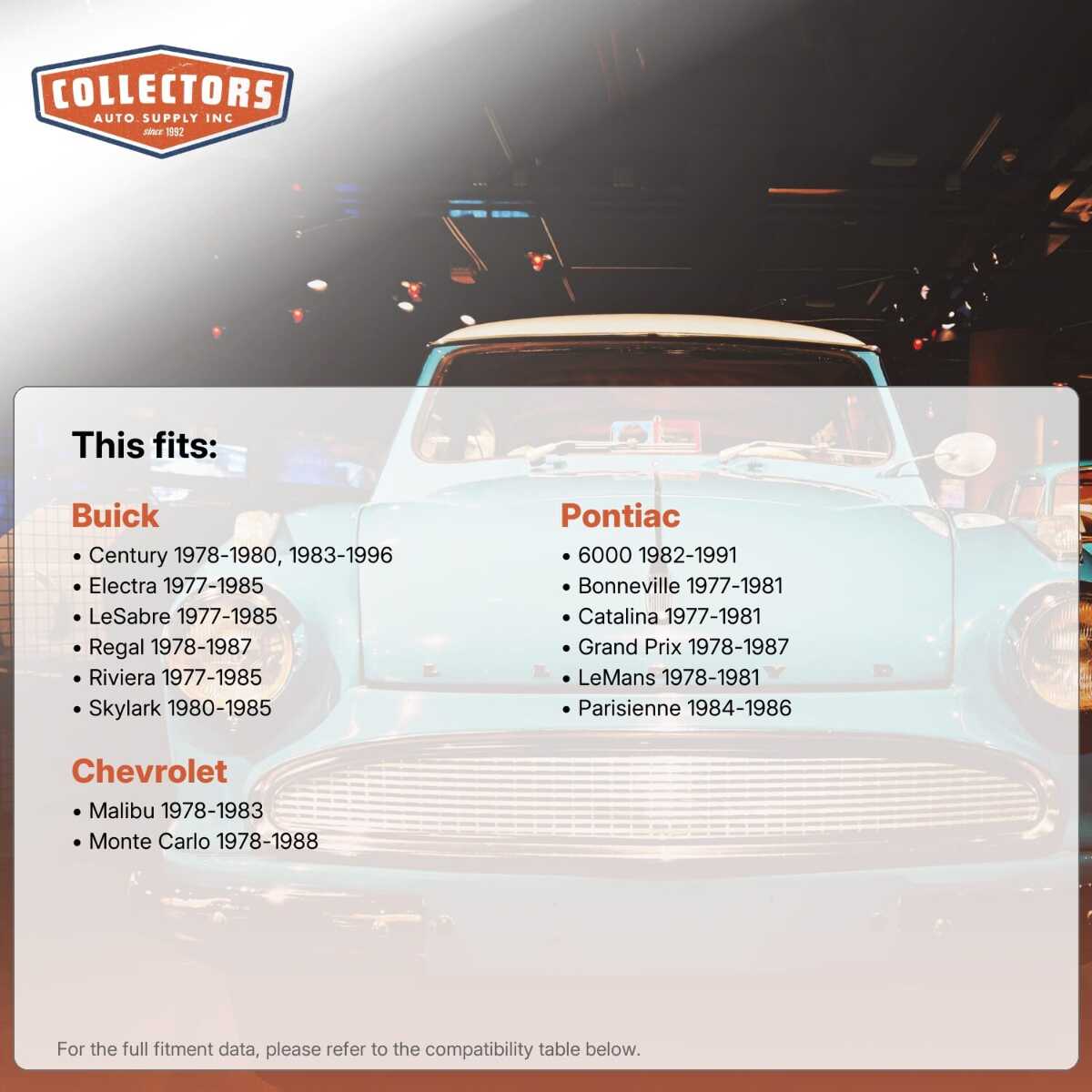 This auto part is covered by Collectors Auto Supply's three-dimensional promise — you'll get the right part the first time, you can talk to us, and with over 25 years in business and 100,000+ customer transactions, you can trust us to be the right choice to fuel your passion.