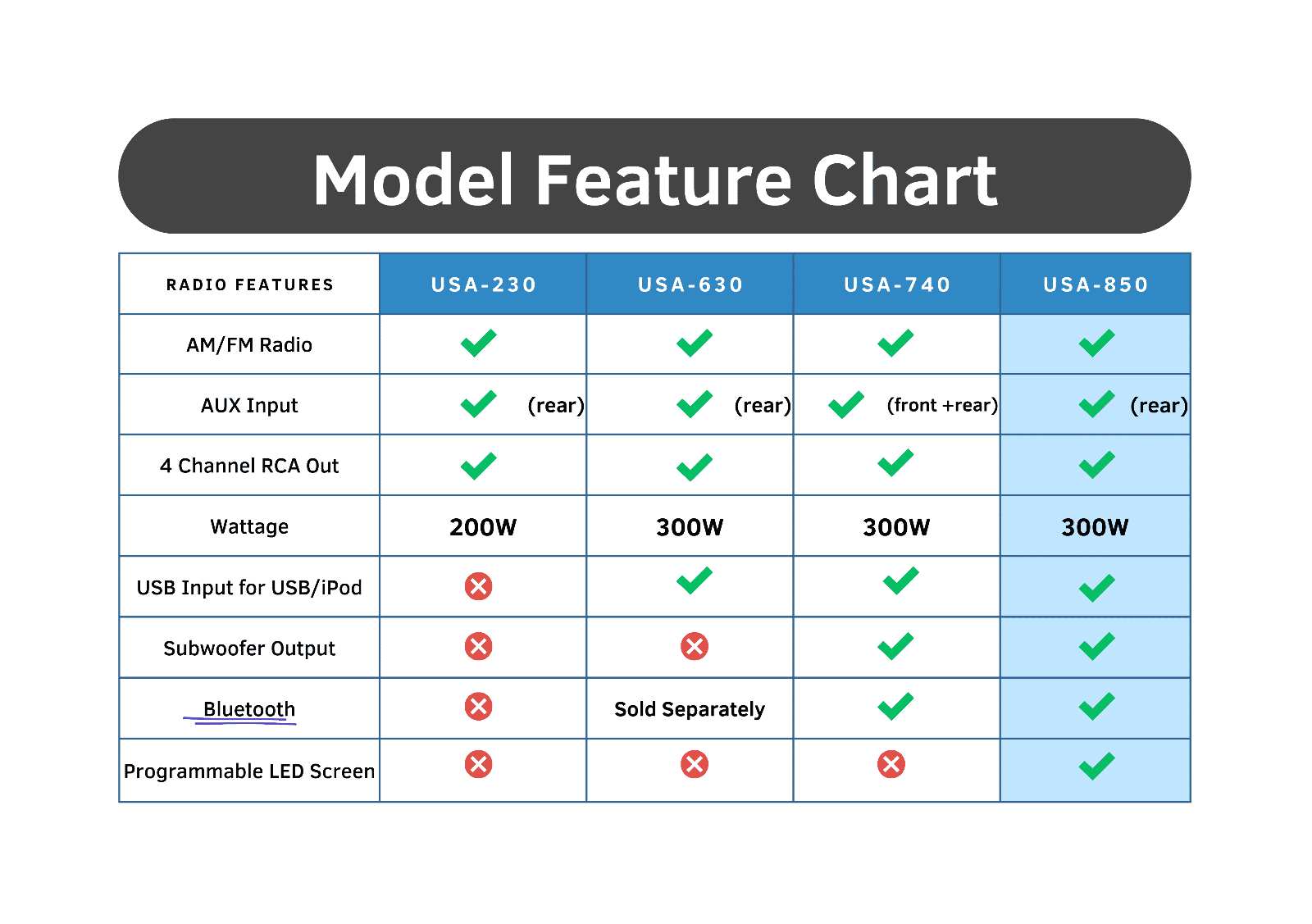 The USA-850 is our latest model, featuring our innovative virtual analog DigiDial? radio screen technology. This unique screen offers 4 distinct display options, each providing a one-of-a-kind experience. Choose from a classic 60?s style analogting, where the red needle smoothly glides across the display as you tune to your favorite AM/FM radio stations, or opt for the RDS all-digital display, showing station, song, and artist information. Whichever display you choose, you'll enjoy clear, concise, and attractive feedback, enhancing your radio experience.